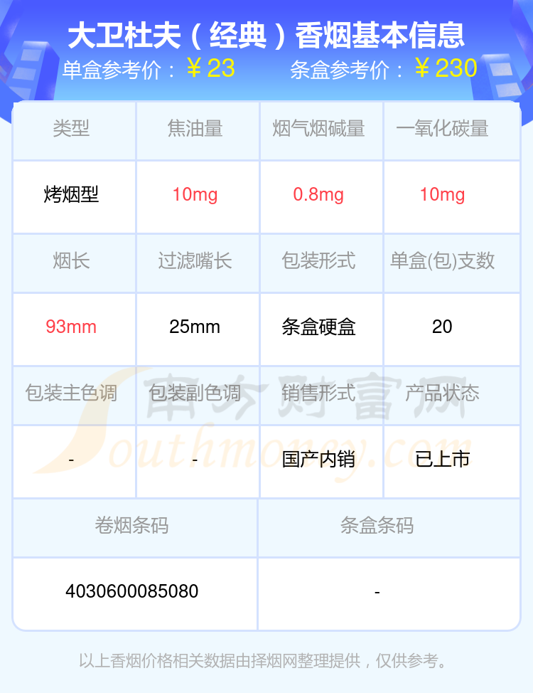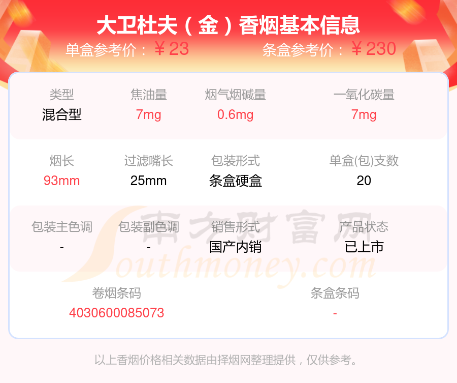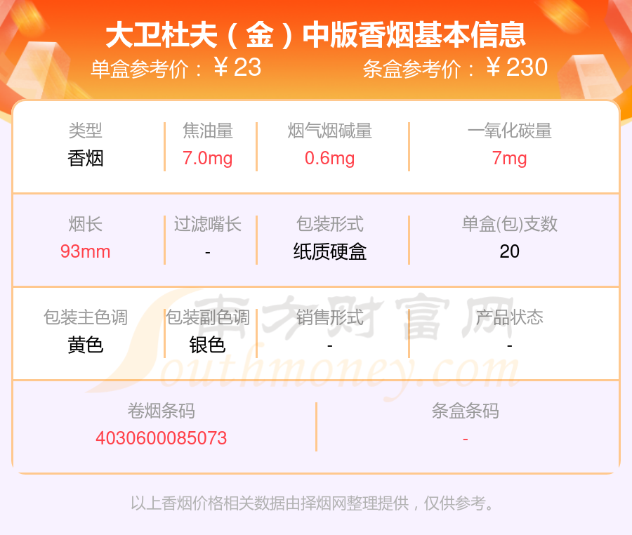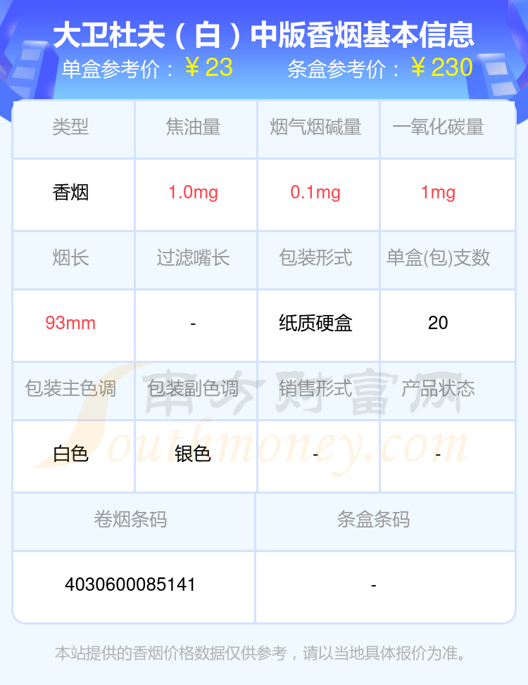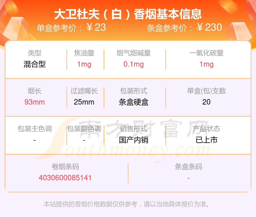 大衛(wèi)杜夫(金裝港版)參考價29.0元/包、大衛(wèi)杜夫(白)中版參考價23.0元/包、大衛(wèi)杜夫(金)中版參考價23.0元/包、大衛(wèi)杜夫(經(jīng)典)中版參考價23.0元/包、大衛(wèi)杜夫(藍)中版參考價23.0元/包、大衛(wèi)杜夫(白)參考價23元/包、大衛(wèi)杜夫(藍)參考價23元/包、大衛(wèi)杜夫(金)參考價23元/包、大衛(wèi)杜夫(經(jīng)典)參考價23元/包、大衛(wèi)杜夫(白特醇免稅寬版)參考價20.0元/包等。