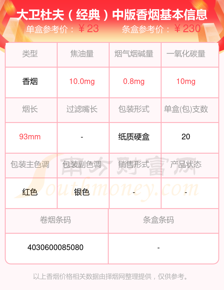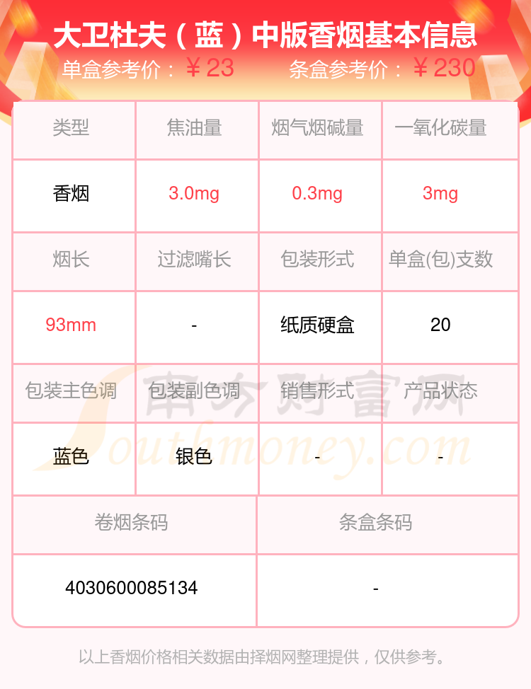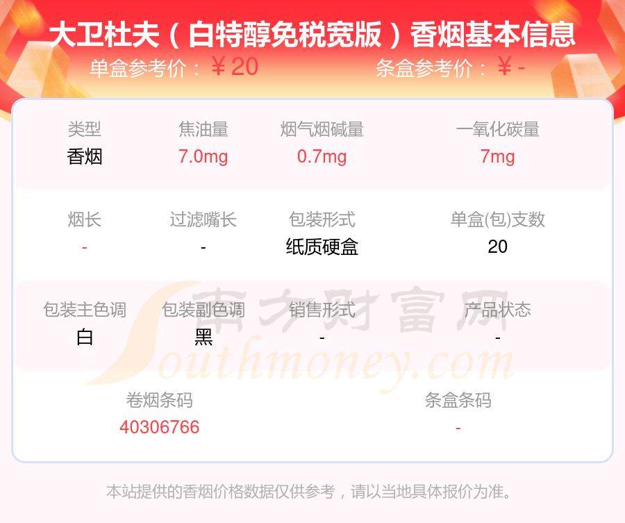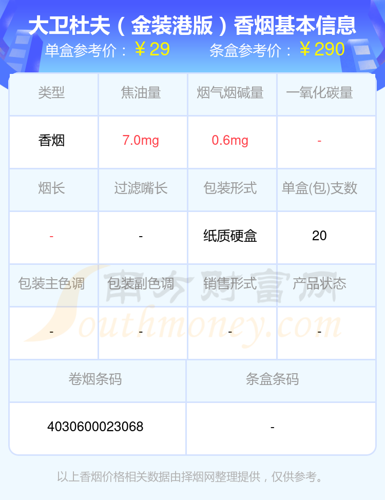 大衛(wèi)杜夫(金裝港版)參考價29.0元/包、大衛(wèi)杜夫(白)中版參考價23.0元/包、大衛(wèi)杜夫(金)中版參考價23.0元/包、大衛(wèi)杜夫(經(jīng)典)中版參考價23.0元/包、大衛(wèi)杜夫(藍)中版參考價23.0元/包、大衛(wèi)杜夫(白)參考價23元/包、大衛(wèi)杜夫(藍)參考價23元/包、大衛(wèi)杜夫(金)參考價23元/包、大衛(wèi)杜夫(經(jīng)典)參考價23元/包、大衛(wèi)杜夫(白特醇免稅寬版)參考價20.0元/包等。