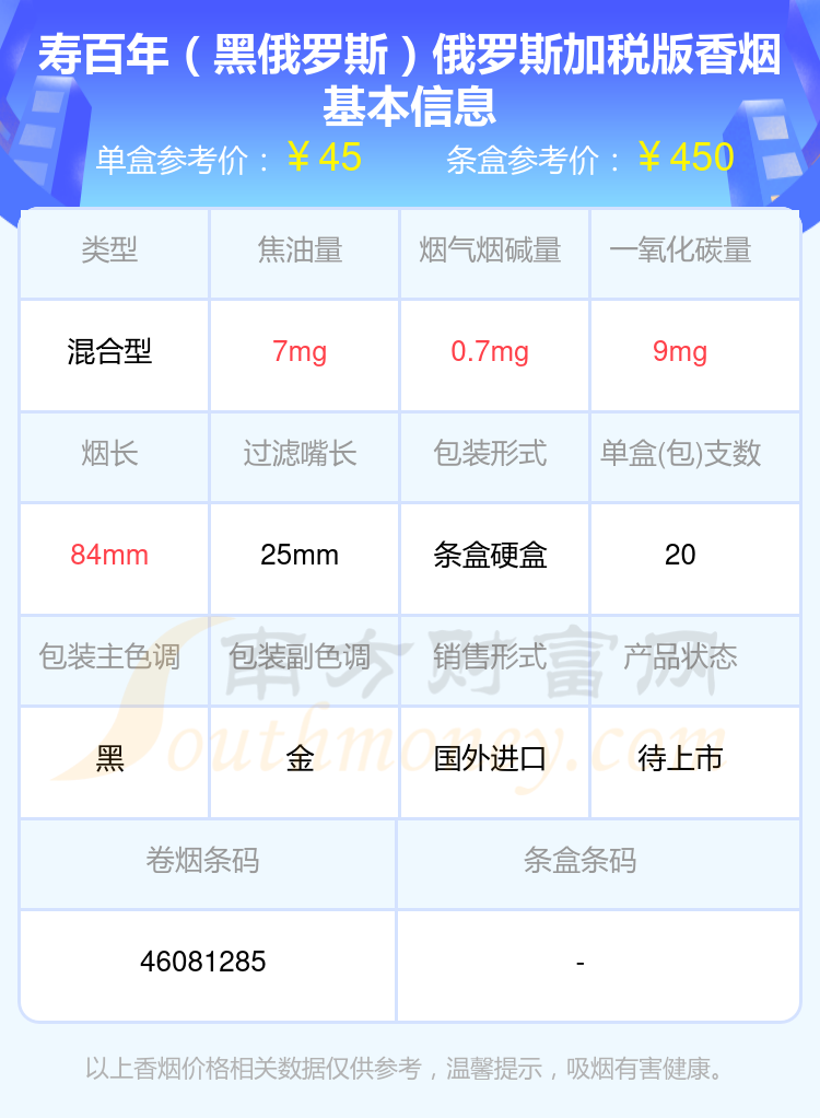 壽百年(雞尾酒)日版參考價45.0元/包、壽百年(黑俄羅斯)俄羅斯加稅版參考價45元/包等。