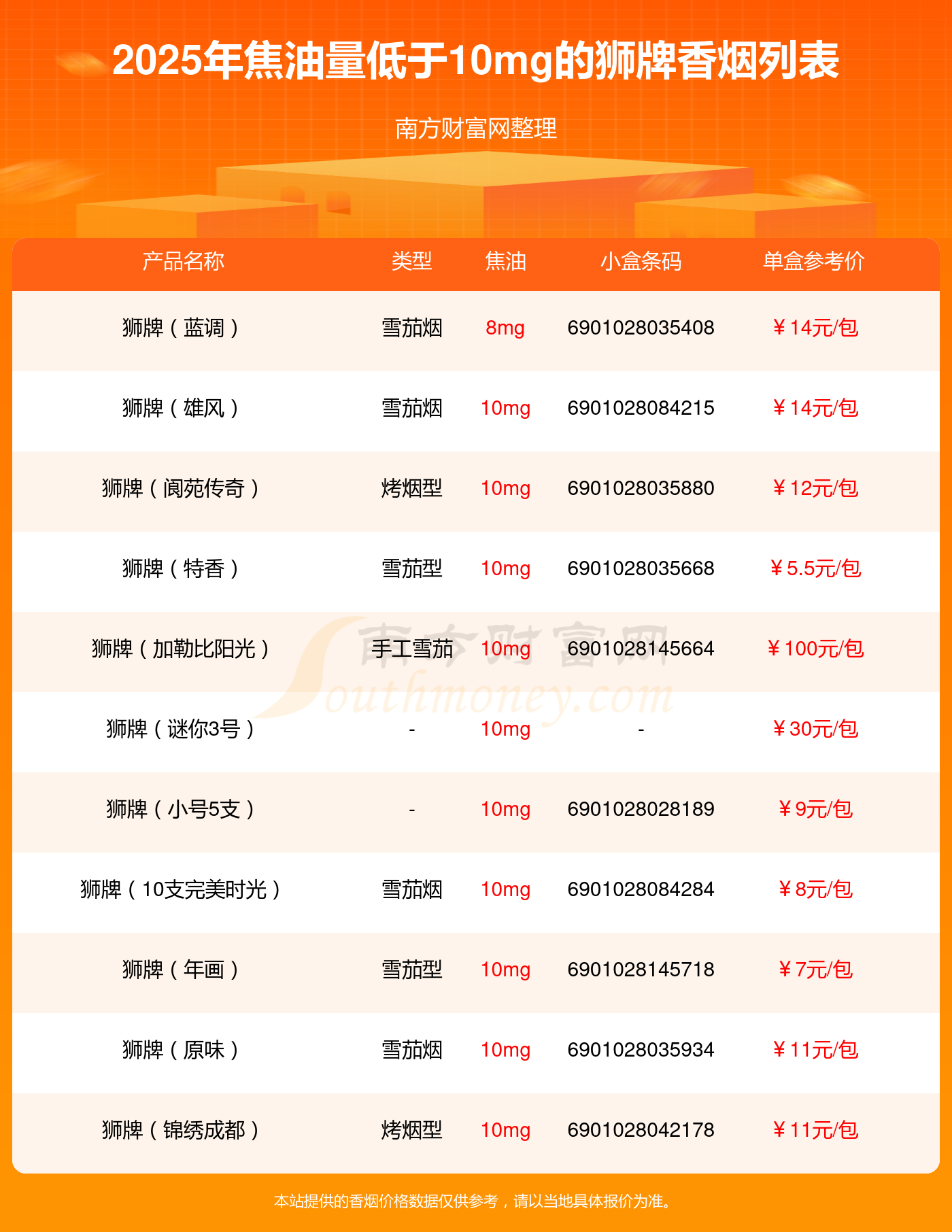 焦油量低于10mg的獅牌香煙有哪些?擇煙網(wǎng)為大家整理盤點,分別有:獅牌(藍(lán)調(diào))、獅牌(雄風(fēng))、獅牌(閬苑傳奇)、獅牌(特香)、獅牌(加勒比陽光)、獅牌(謎你3號)、獅牌(小號5支)、獅牌(10支完美時光)、獅牌(年畫)、獅牌(原味)等,具體價格如下: