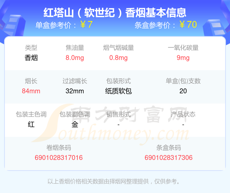 擇煙網為大家盤點了焦油量低于10mg的紅塔山香煙,有紅塔山(細支傳奇)、紅塔山(硬世紀)、紅塔山(軟世紀)、紅塔山(軟紅大師)、紅塔山(軟新)、紅塔山(大師)、紅塔山(細支傳奇)舊版、紅塔山(細支傳奇)舊版升級版、紅塔山(經典150)、紅塔山(軟經典100)等,詳細價格如下: