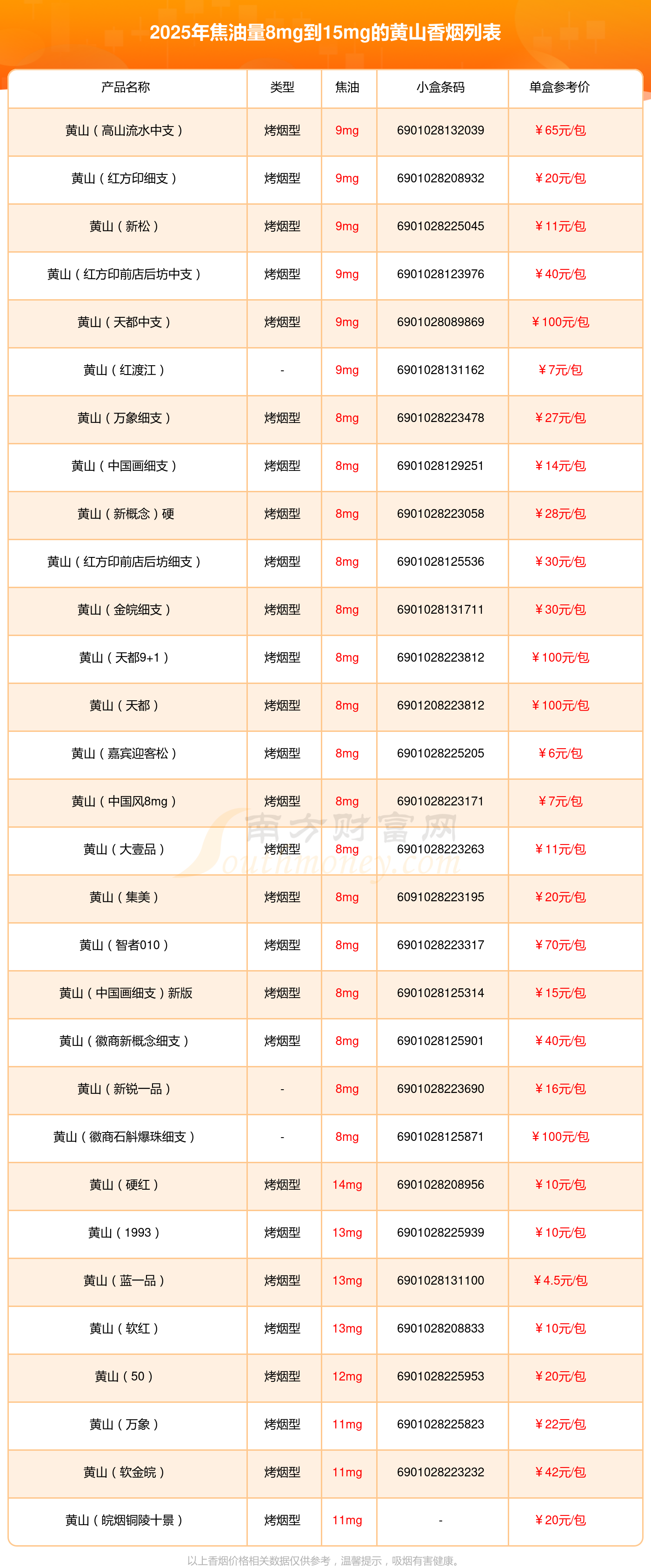 黃山香煙焦油量8mg到15mg的有哪些?擇煙網(wǎng)為大家整理提供,分別有: