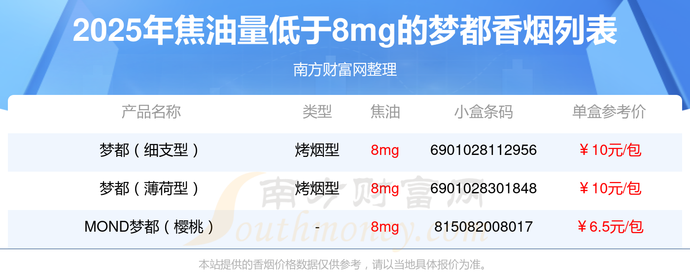 夢都香煙焦油量低于8mg的煙有夢都(細(xì)支型)、夢都(薄荷型)、MOND夢都(櫻桃)等,詳細(xì)價格如下: