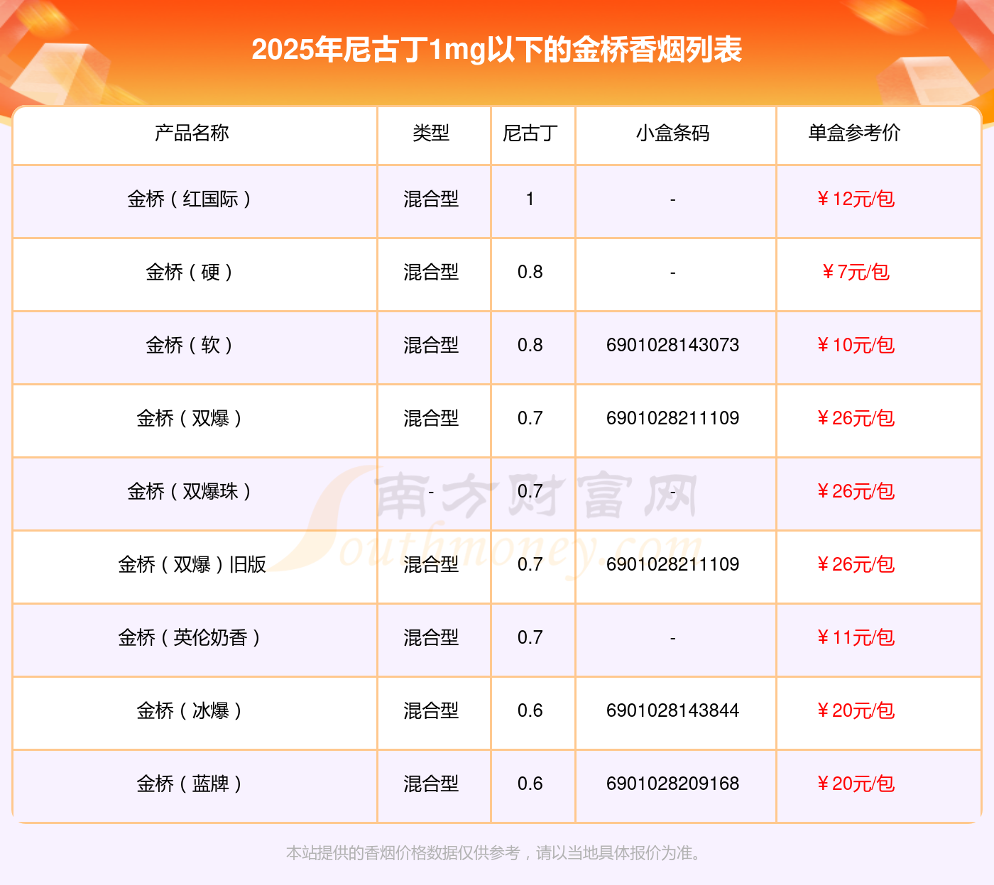 尼古丁1mg以下的金橋香煙有哪些?擇煙網(wǎng)為大家整理盤點,有金橋(紅國際)、金橋(硬)、金橋(軟)、金橋(雙爆)、金橋(雙爆珠)、金橋(雙爆)舊版、金橋(英倫奶香)、金橋(冰爆)、金橋(藍(lán)牌)等,詳細(xì)價格如下: