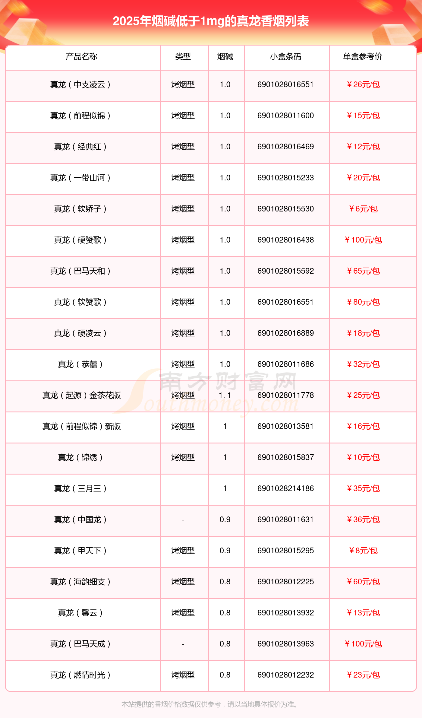 真龍(中支凌云)參考價(jià)26.0元/包、真龍(前程似錦)參考價(jià)15.0元/包、真龍(經(jīng)典紅)參考價(jià)12.0元/包、真龍(一帶山河)參考價(jià)20.0元/包、真龍(軟嬌子)參考價(jià)6.0元/包、真龍(硬贊歌)參考價(jià)100.0元/包、真龍(巴馬天和)參考價(jià)65.0元/包、真龍(軟贊歌)參考價(jià)80.0元/包、真龍(硬凌云)參考價(jià)18.0元/包、真龍(恭囍)參考價(jià)32.0元/包等。
