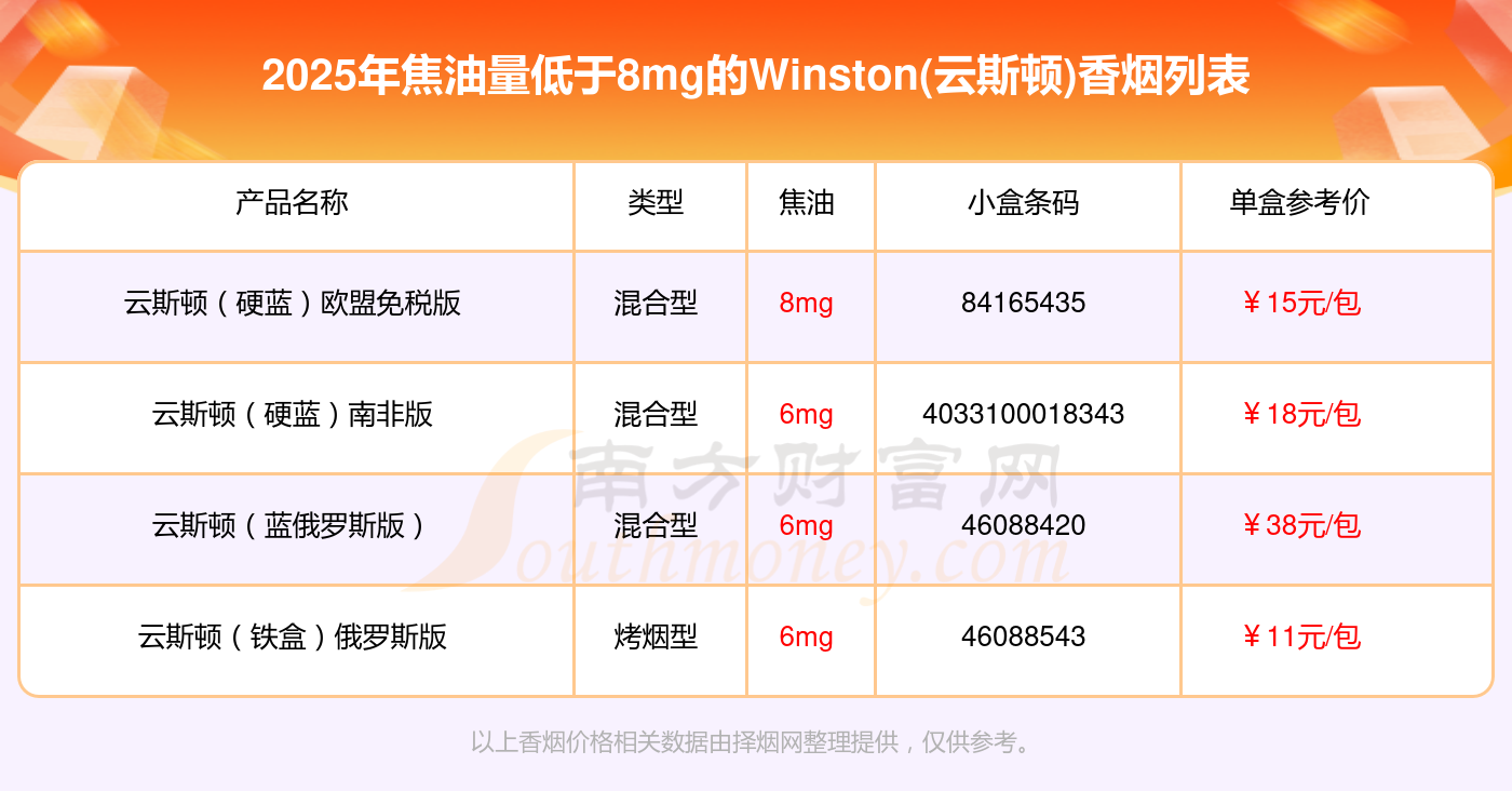 焦油量低于8mg的Winston(云斯頓)香煙有哪些?擇煙網(wǎng)為大家整理盤點(diǎn),分別有:云斯頓(硬藍(lán))歐盟免稅版、云斯頓(硬藍(lán))南非版、云斯頓(藍(lán)俄羅斯版)、云斯頓(鐵盒)俄羅斯版等,具體價(jià)格如下: