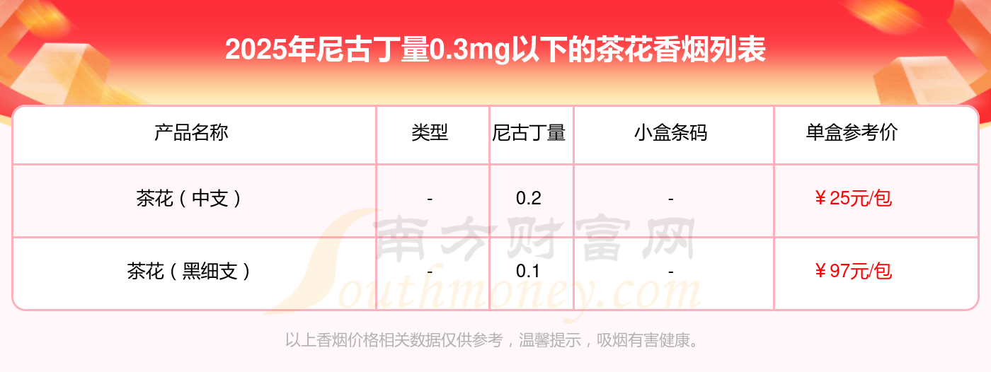茶花香煙尼古丁量0.3mg以下的煙有哪些?擇煙網(wǎng)為大家整理提供,分別有:茶花(中支)、茶花(黑細(xì)支)等,具體價格如下: