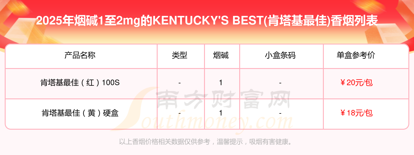 擇煙網(wǎng)為大家盤點(diǎn)了KENTUCKY'S BEST(肯塔基最佳)香煙煙堿1至2mg的,分別有肯塔基最佳(紅)100S、肯塔基最佳(黃)硬盒等,具體價(jià)格如下: