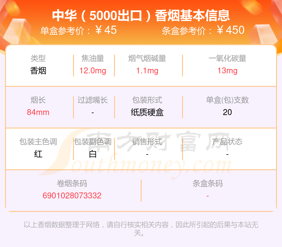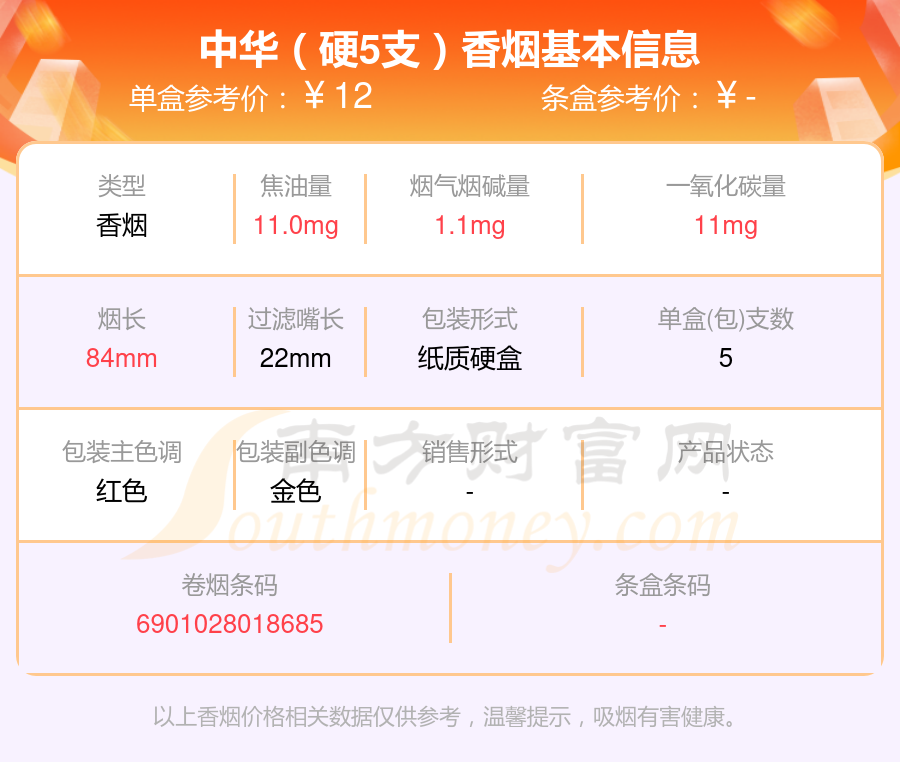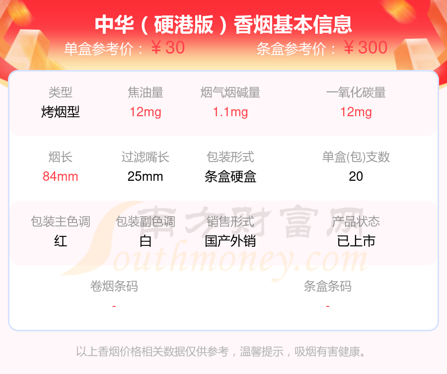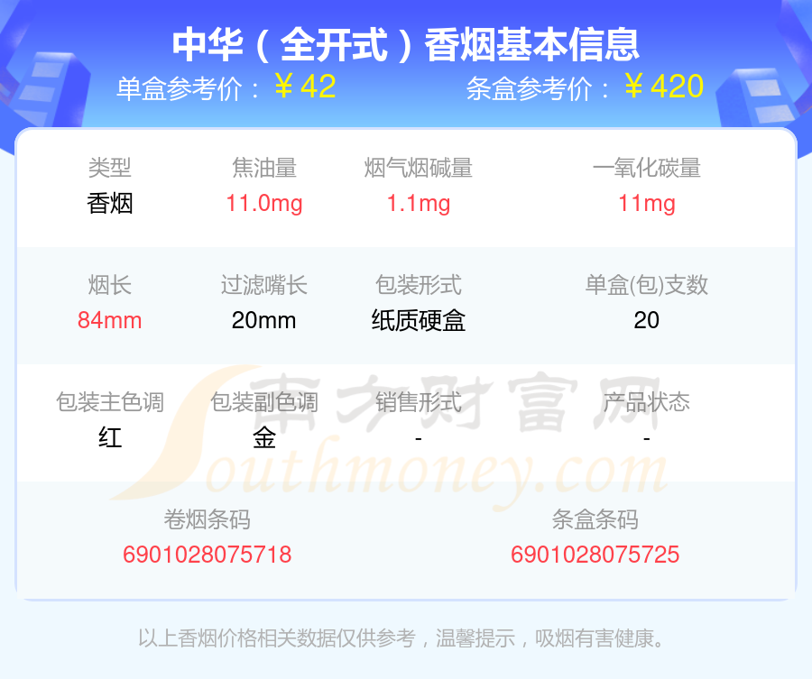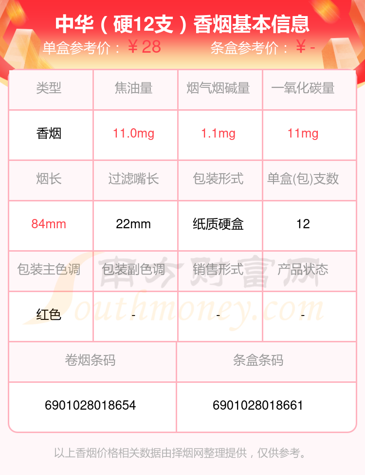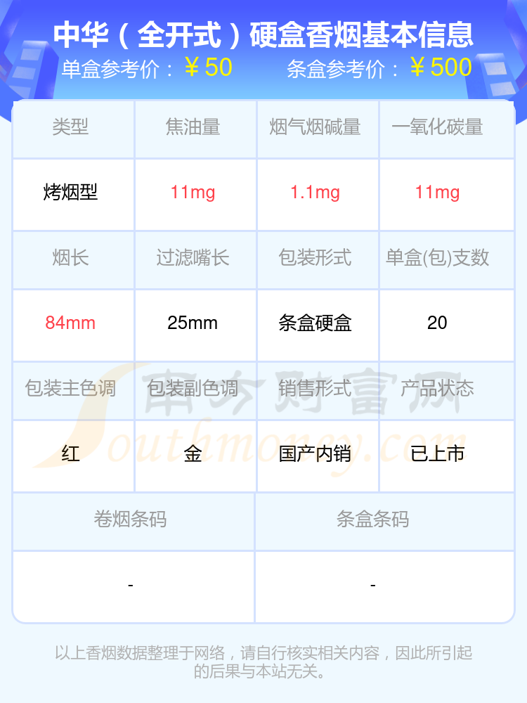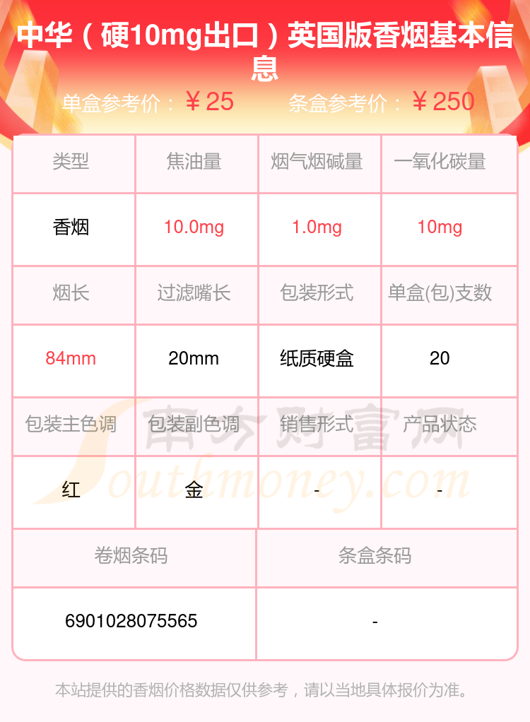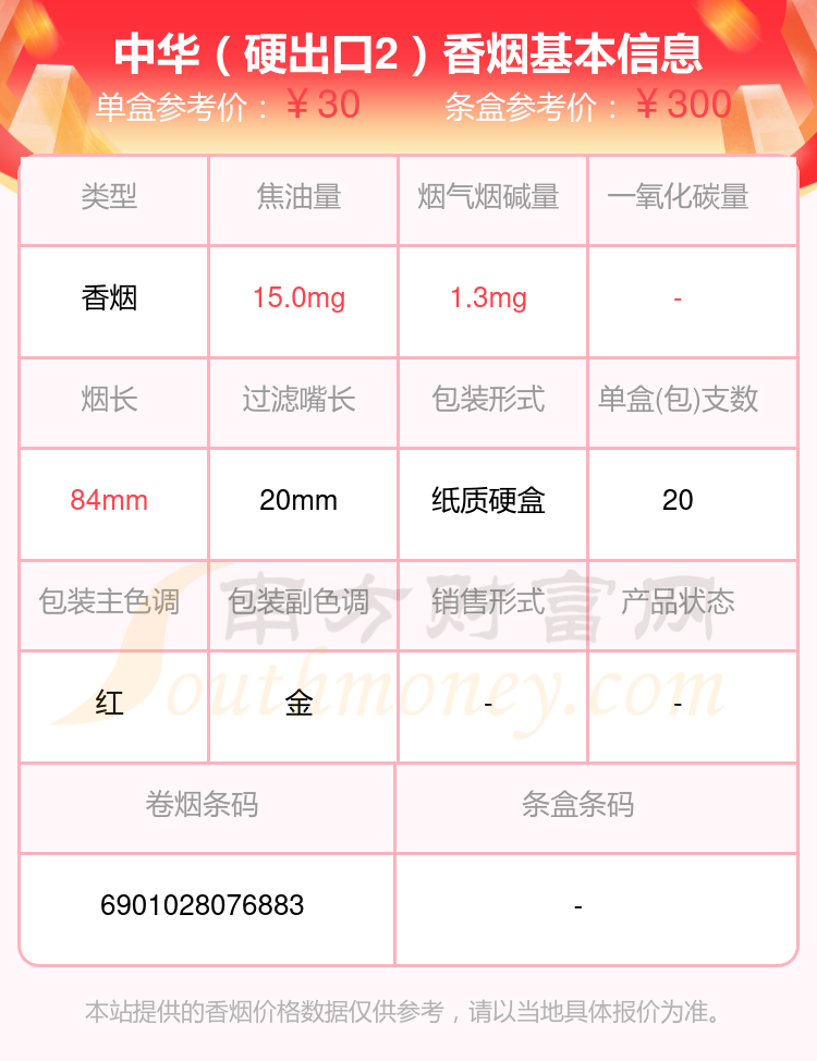 中華(硬出口2)參考價30.0元/包、中華(全開式)參考價42.0元/包、中華(硬5支)參考價12.0元/包、中華(全開式)硬盒參考價50元/包、中華(硬12支)參考價28.0元/包、中華(硬港版)參考價30元/包、中華(5000出口)參考價45.0元/包、中華(硬11mg12支旅游)參考價30.0元/包、中華(5000)參考價50.0元/包、中華(硬10mg出口)英國版參考價25.0元/包等。