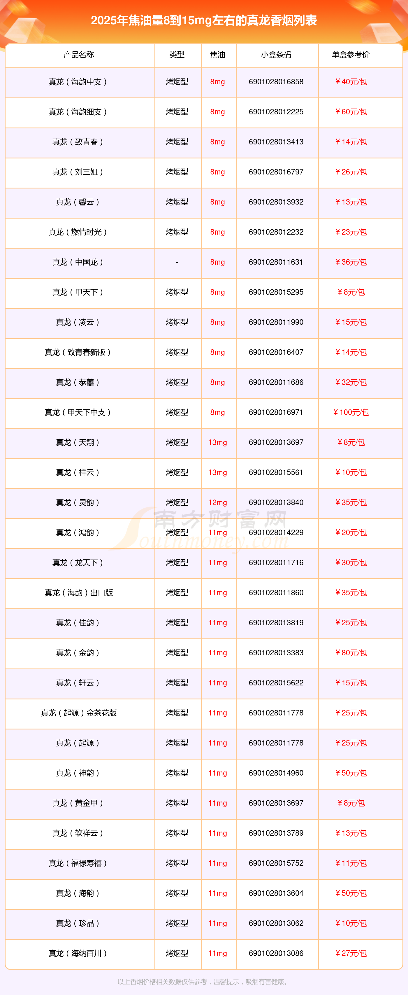 真龍香煙焦油量8到15mg左右的煙有真龍(海韻中支)、真龍(海韻細(xì)支)、真龍(致青春)、真龍(劉三姐)、真龍(馨云)、真龍(燃情時(shí)光)、真龍(中國(guó)龍)、真龍(甲天下)、真龍(凌云)、真龍(致青春新版)等,詳細(xì)價(jià)格如下: