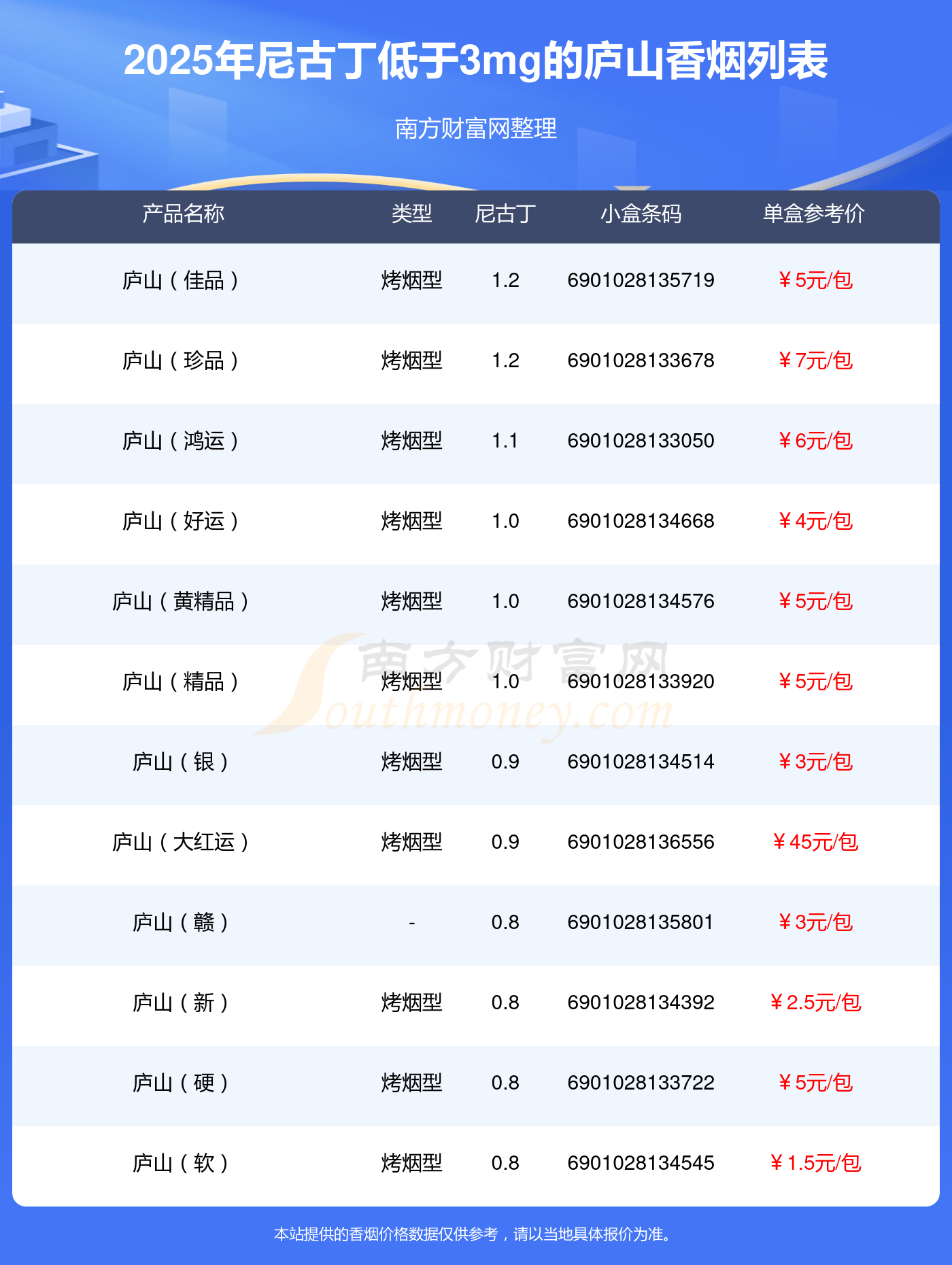 尼古丁低于3mg的廬山香煙有哪些?擇煙網(wǎng)為大家整理盤點(diǎn),有廬山(佳品)、廬山(珍品)、廬山(鴻運(yùn))、廬山(好運(yùn))、廬山(黃精品)、廬山(精品)、廬山(銀)、廬山(大紅運(yùn))、廬山(贛)、廬山(新)等,詳細(xì)價(jià)格如下: