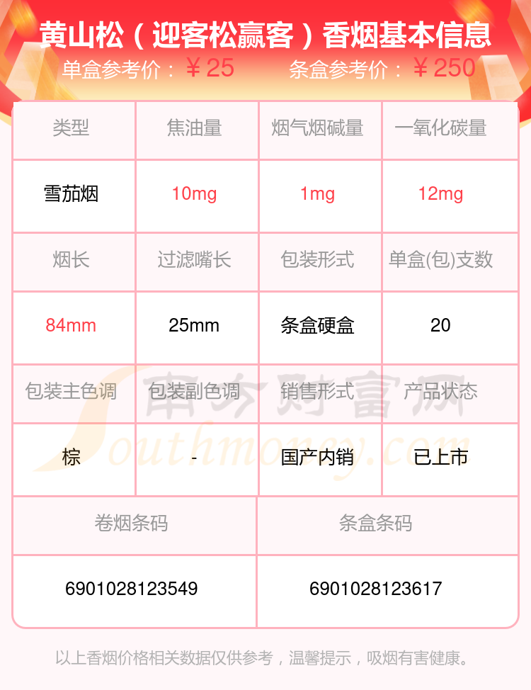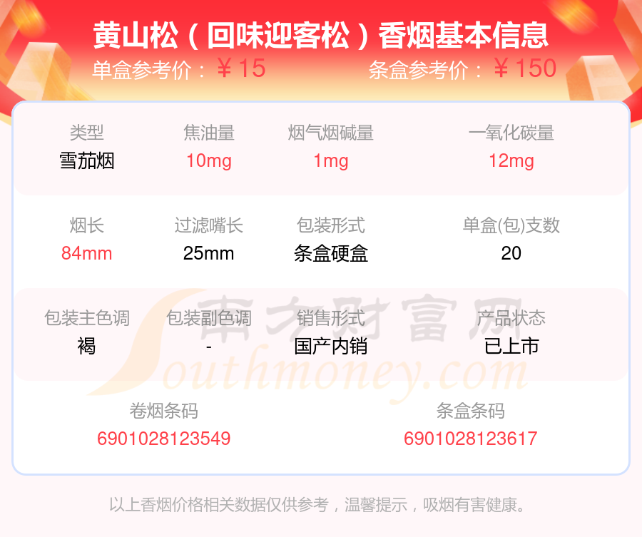 黃山松香煙尼古丁量低于2mg的煙分別有黃山松(迎客松贏客)參考價(jià)25元/包、黃山松(回味迎客松)參考價(jià)15元/包等。