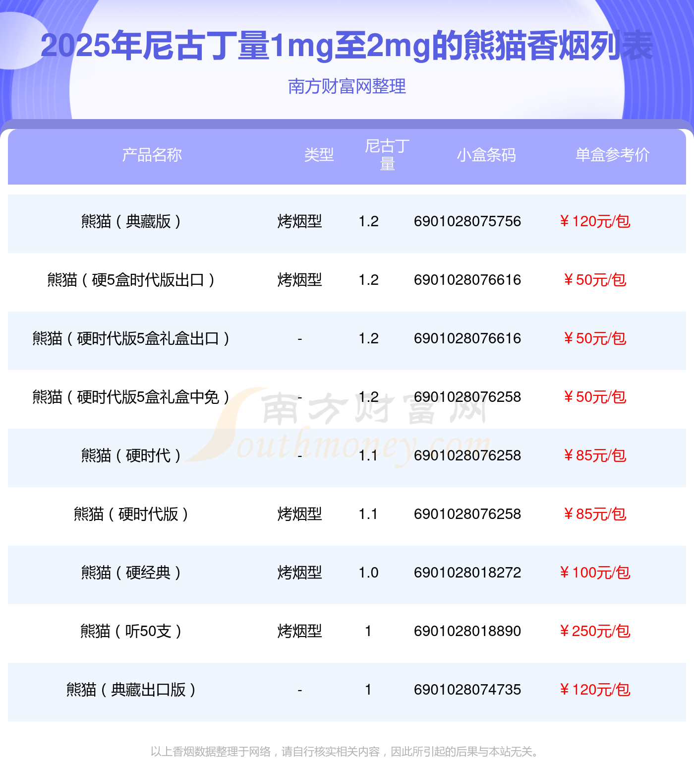 擇煙網(wǎng)為大家盤點(diǎn)了尼古丁量1mg至2mg的熊貓香煙,有以下這些: