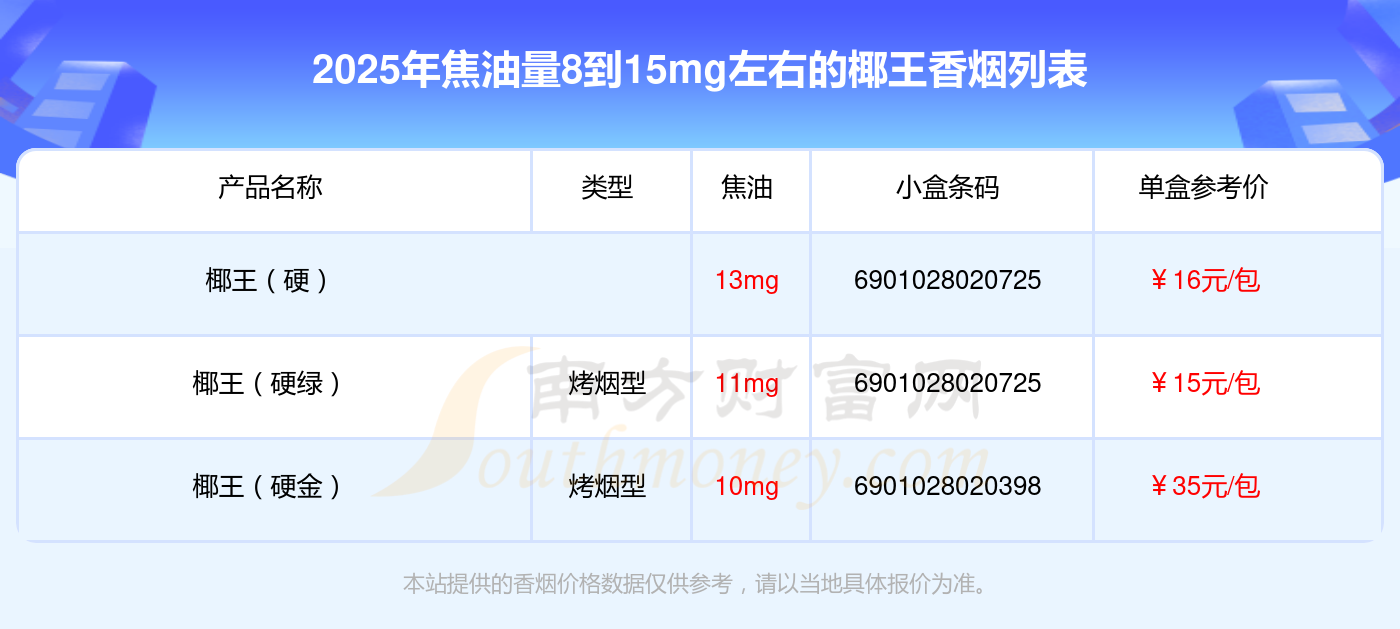擇煙網(wǎng)為大家盤點了焦油量8到15mg左右的椰王香煙,有以下這些: