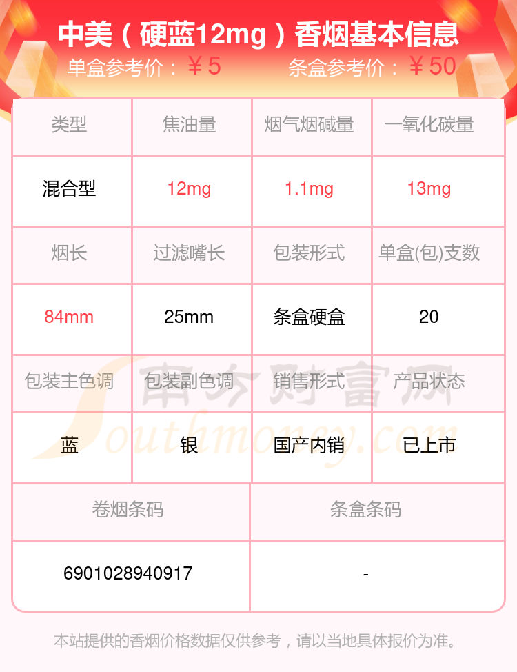 擇煙網(wǎng)為大家盤點(diǎn)了尼古丁量低于5mg的中美香煙,分別有中美(硬藍(lán)12mg)、中美(國際版紅)等,具體價(jià)格如下: