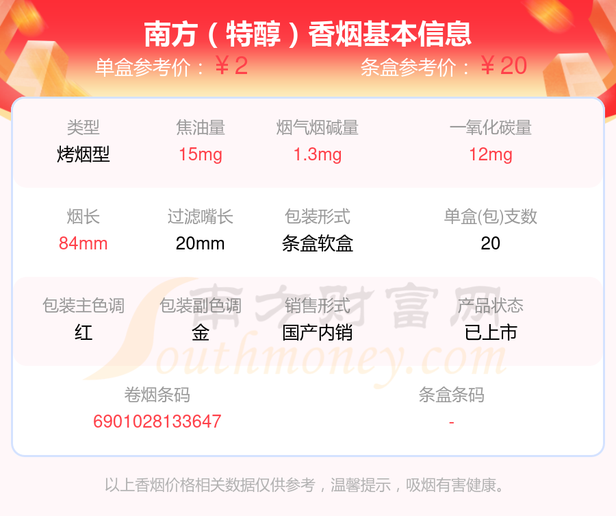 南方香煙煙堿量低于3mg的煙分別有南方(特醇)參考價(jià)2元/包、南方(千禧)參考價(jià)2.5元/包等。