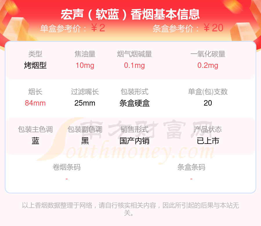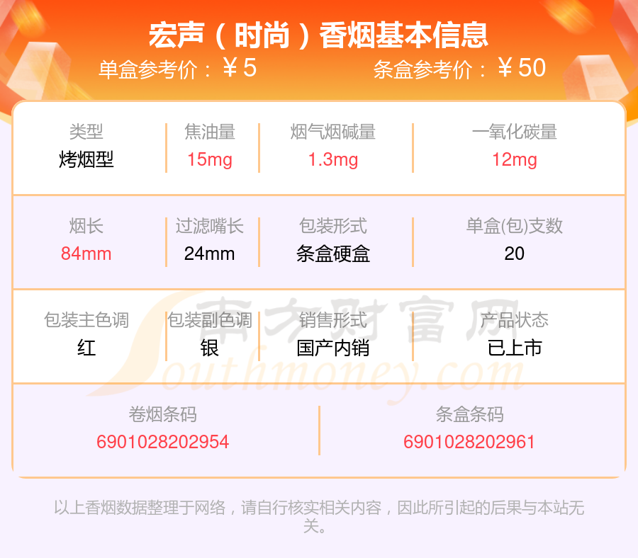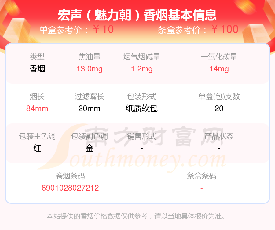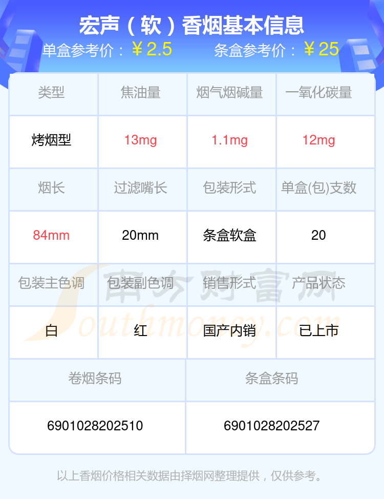宏聲(時(shí)尚)參考價(jià)5元/包、宏聲(魅力朝)參考價(jià)10.0元/包、宏聲(硬)參考價(jià)3元/包、宏聲(精品)參考價(jià)5.5元/包、宏聲(軟)參考價(jià)2.5元/包、宏聲(世紀(jì)朝)參考價(jià)5元/包、宏聲(軟特)參考價(jià)3.5元/包、宏聲(軟藍(lán))參考價(jià)2元/包等。