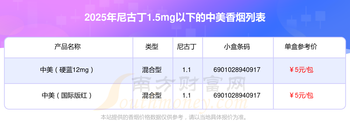 中美(硬藍(lán)12mg)參考價5元/包、中美(國際版紅)參考價5元/包等。