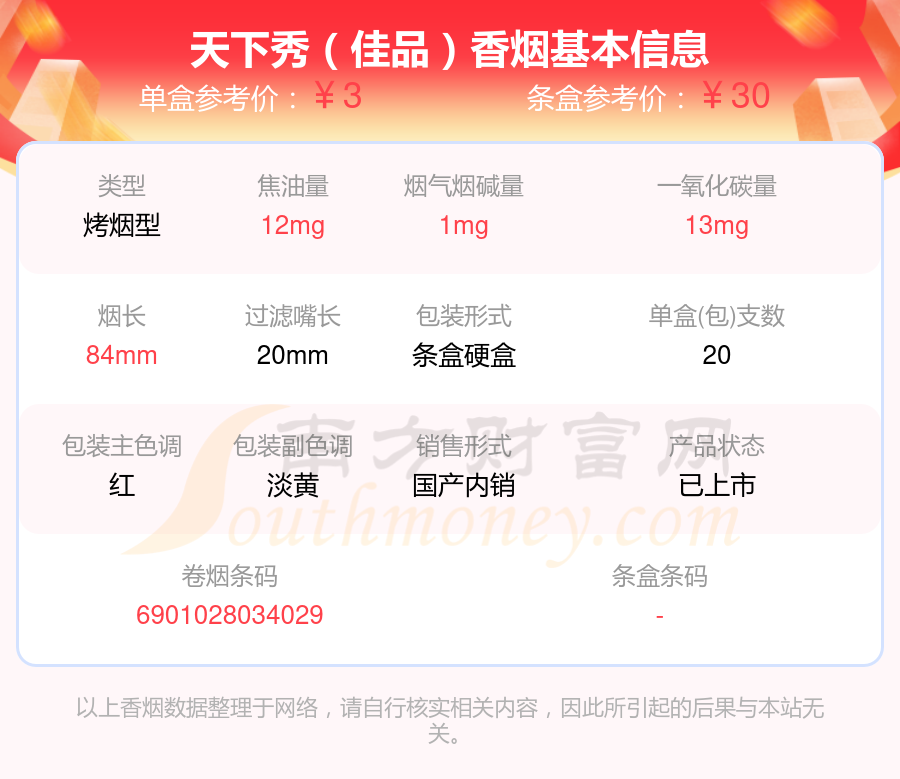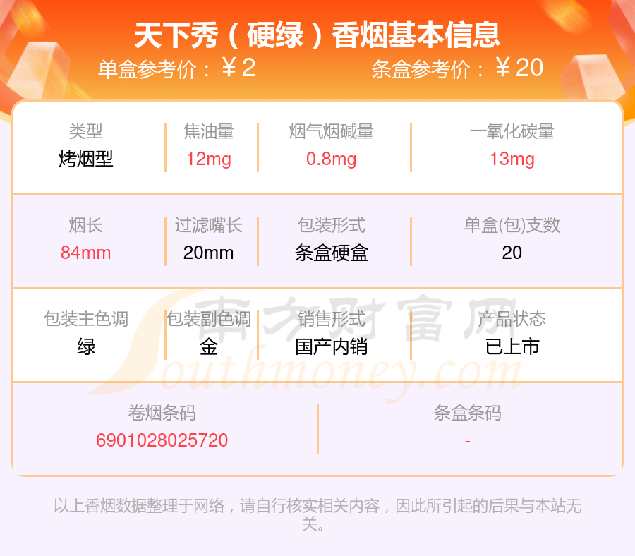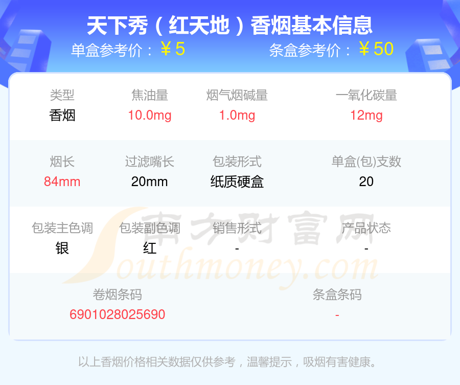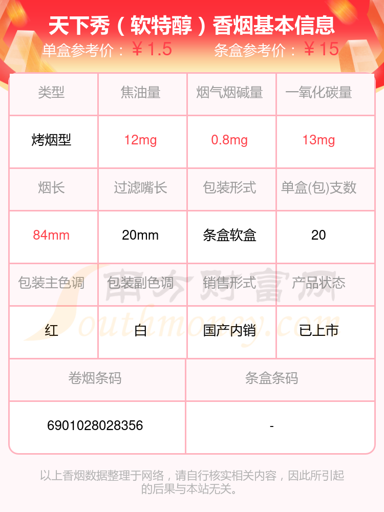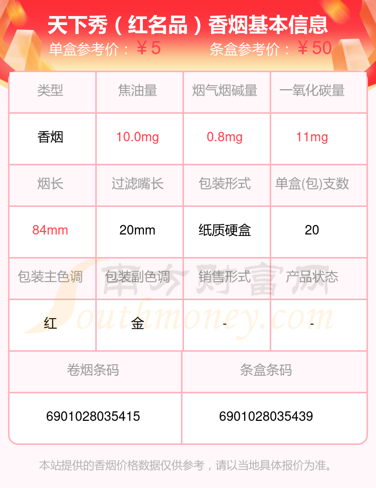 天下秀(紅天地)參考價5.0元/包、天下秀(佳品新版)參考價5元/包、天下秀(佳品)參考價3元/包、天下秀(紅)參考價2.5元/包、天下秀(金)參考價6.0元/包、天下秀(紅名品)參考價5.0元/包、天下秀(硬綠)參考價2元/包、天下秀(軟特醇)參考價1.5元/包等。