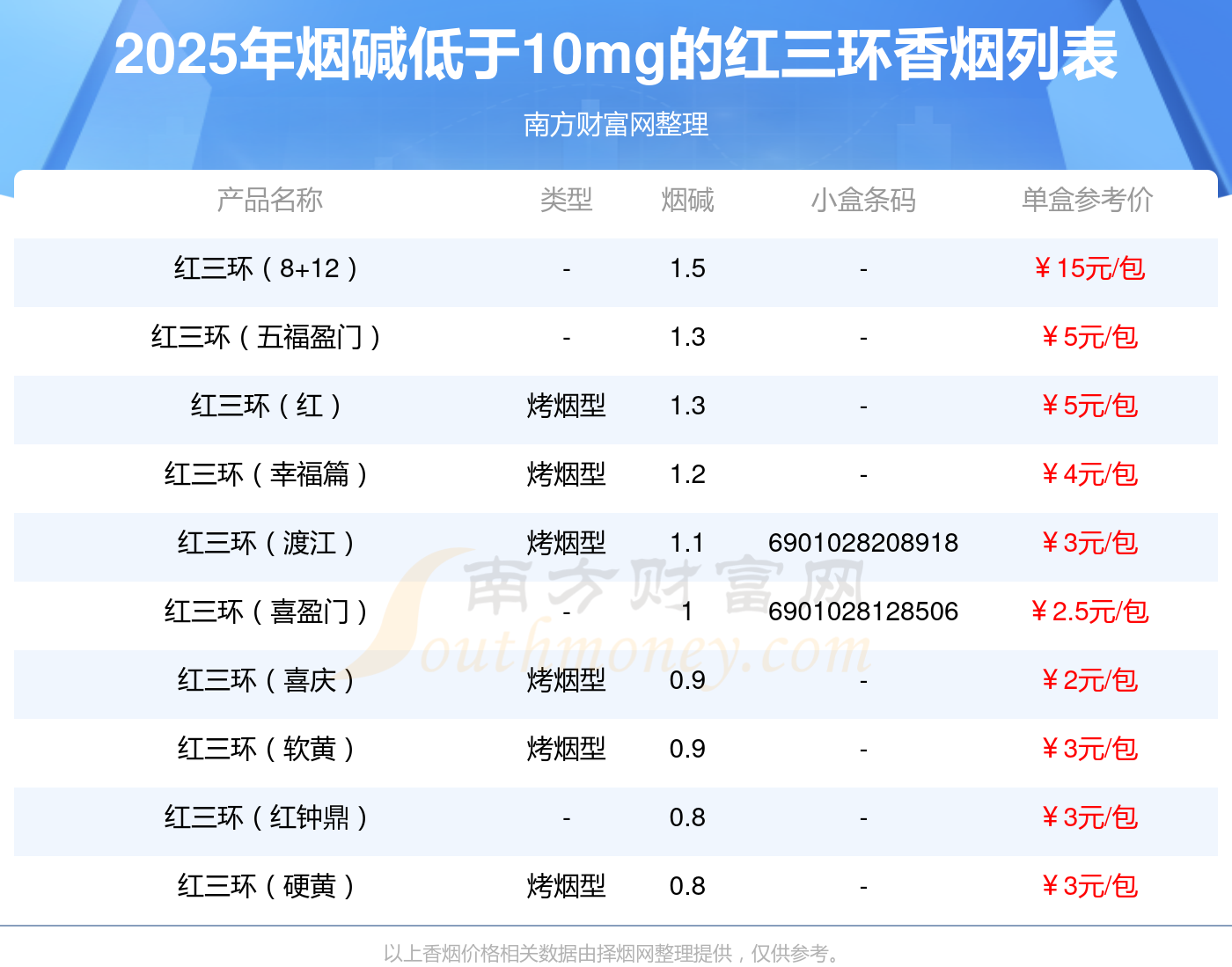 紅三環(huán)(8+12)參考價15元/包、紅三環(huán)(五福盈門)參考價5元/包、紅三環(huán)(紅)參考價5元/包、紅三環(huán)(幸福篇)參考價4元/包、紅三環(huán)(渡江)參考價3元/包、紅三環(huán)(喜盈門)參考價2.5元/包、紅三環(huán)(喜慶)參考價2元/包、紅三環(huán)(軟黃)參考價3元/包、紅三環(huán)(紅鐘鼎)參考價3元/包、紅三環(huán)(硬黃)參考價3元/包等。