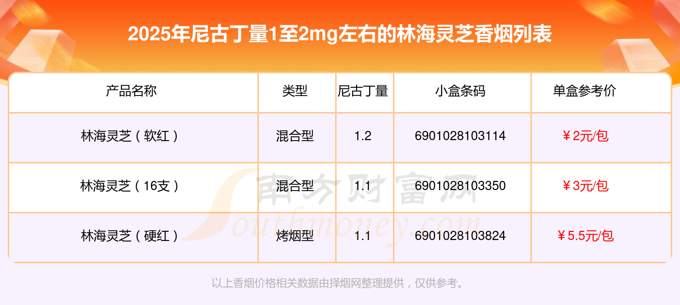 擇煙網(wǎng)為大家盤點(diǎn)了林海靈芝香煙尼古丁量1至2mg左右的煙,有以下這些: