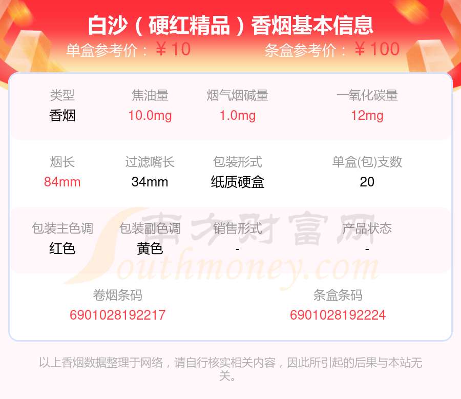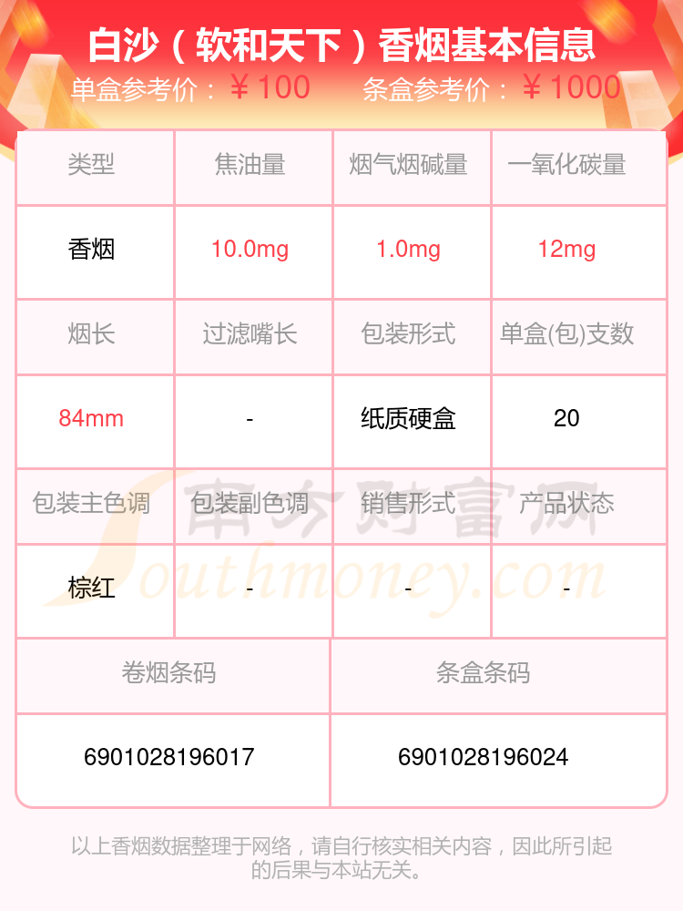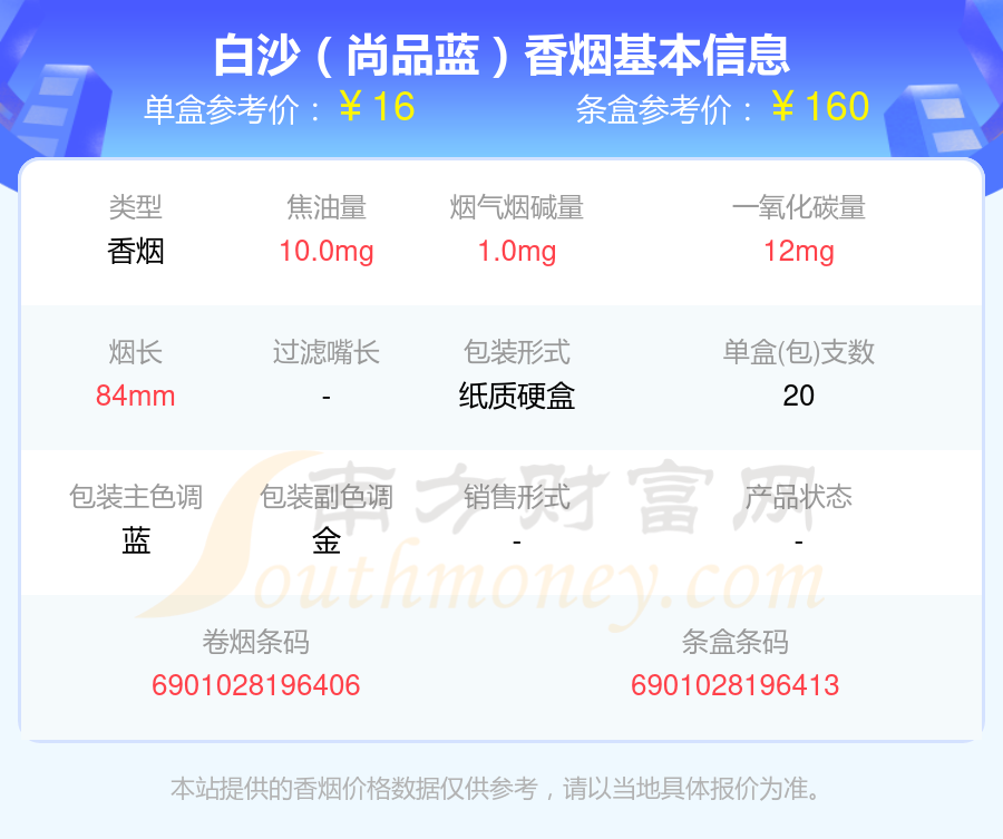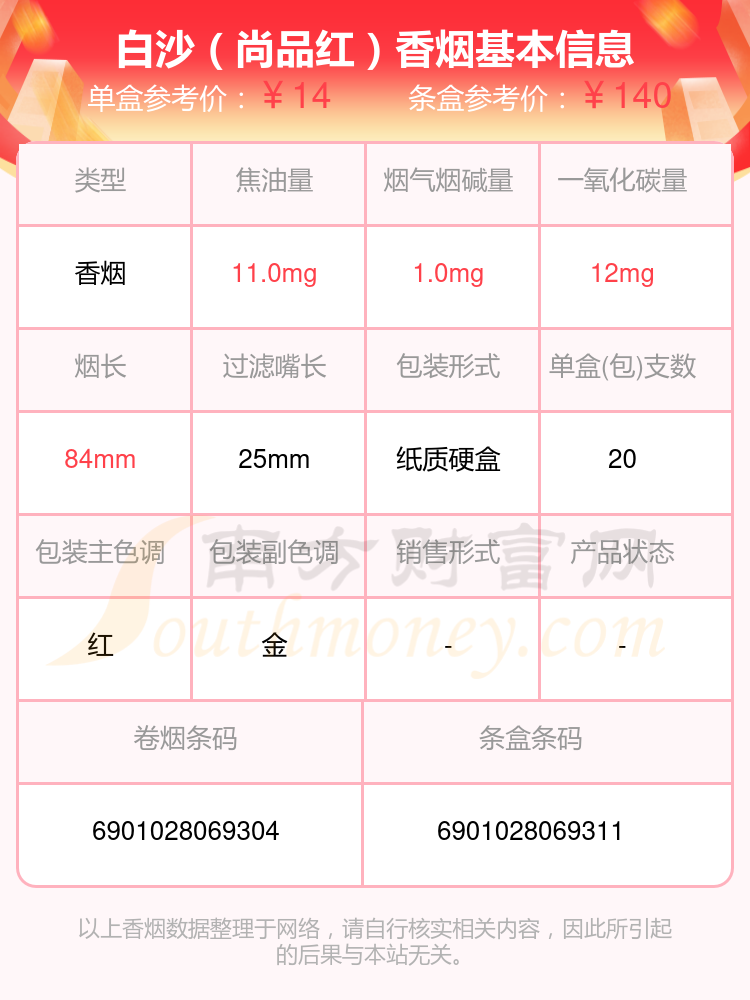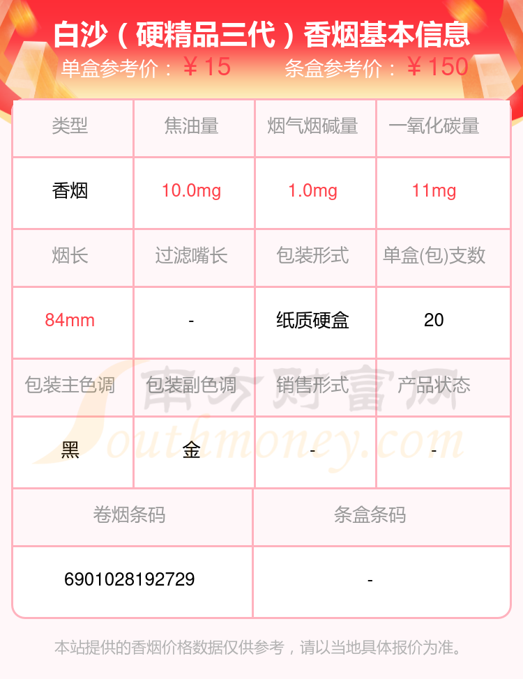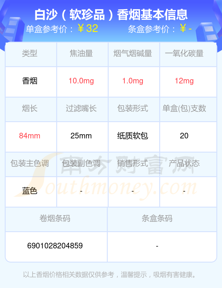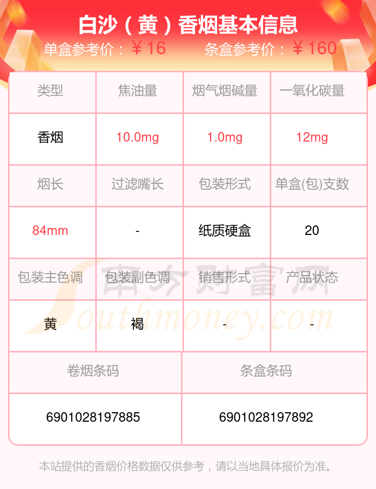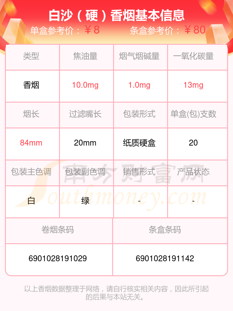 白沙(軟珍品)參考價32.0元/包、白沙(尚品紅)參考價14.0元/包、白沙(黃)參考價16.0元/包、白沙(軟和天下)參考價100.0元/包、白沙(百鶴呈祥)參考價15.0元/包、白沙(尚品藍)參考價16.0元/包、白沙(硬)參考價8.0元/包、白沙(硬精品三代)參考價15.0元/包、白沙(硬紅精品)參考價10.0元/包、白沙(珍品)參考價33.0元/包等。