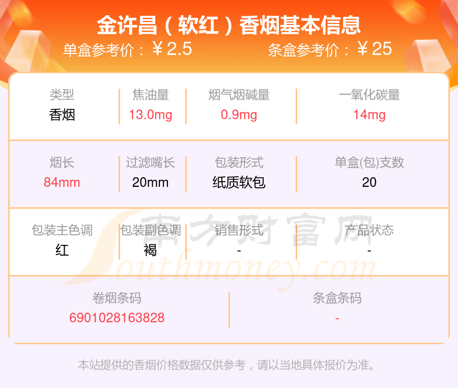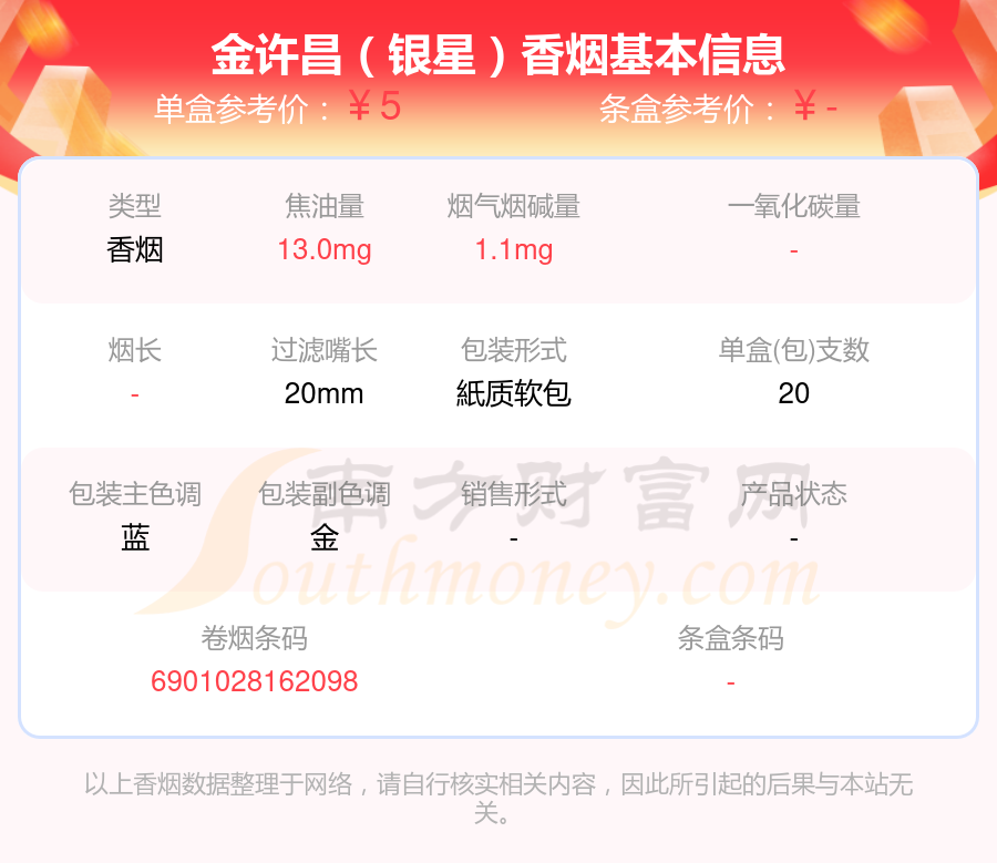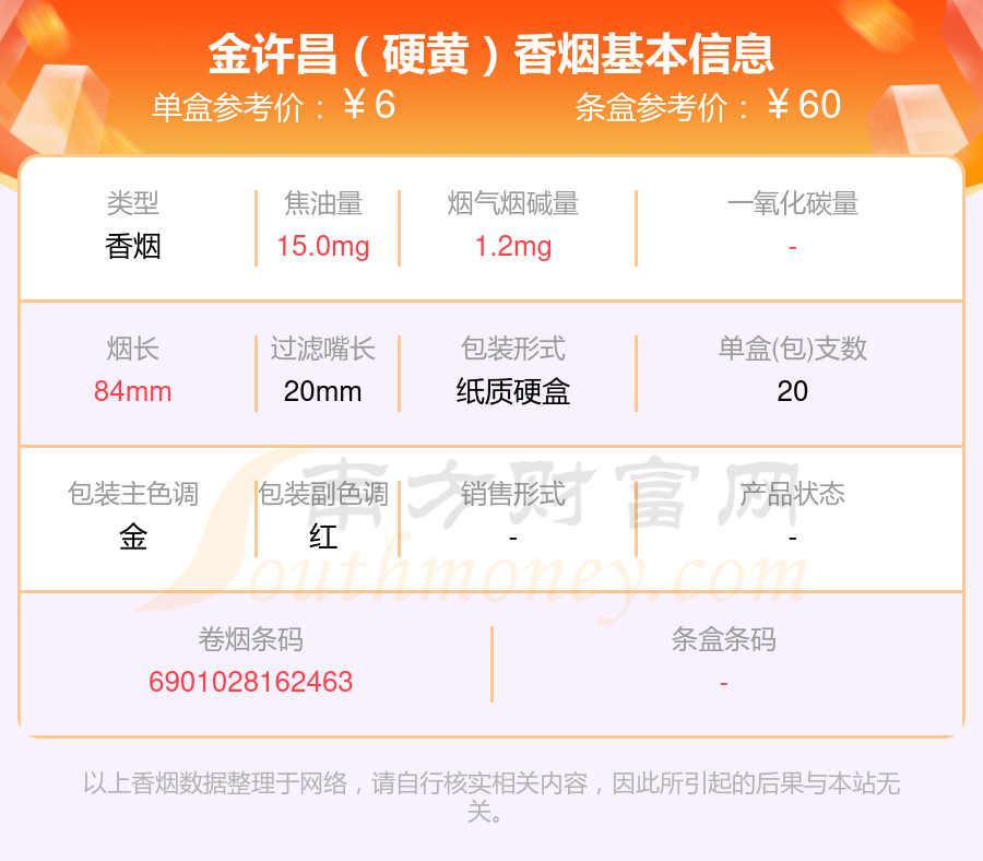 金許昌(硬黃)參考價6.0元/包、金許昌(銀星)參考價5.0元/包、金許昌(硬紅)參考價3.5元/包、金許昌(軟黃)參考價2.0元/包、金許昌(軟紅)參考價2.5元/包等。