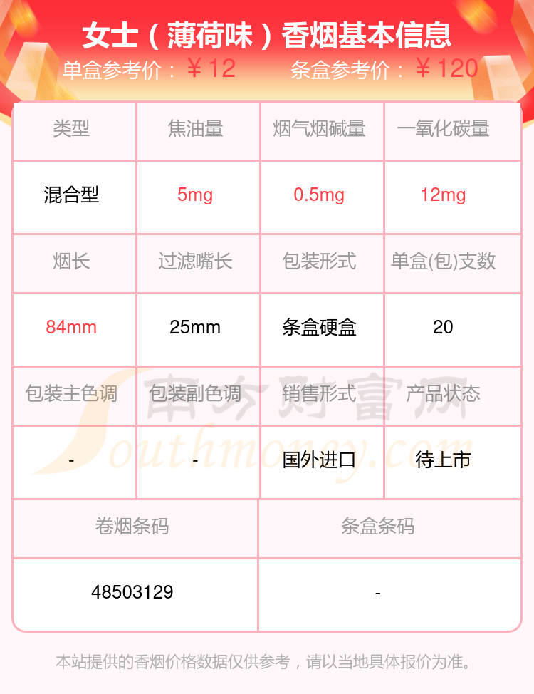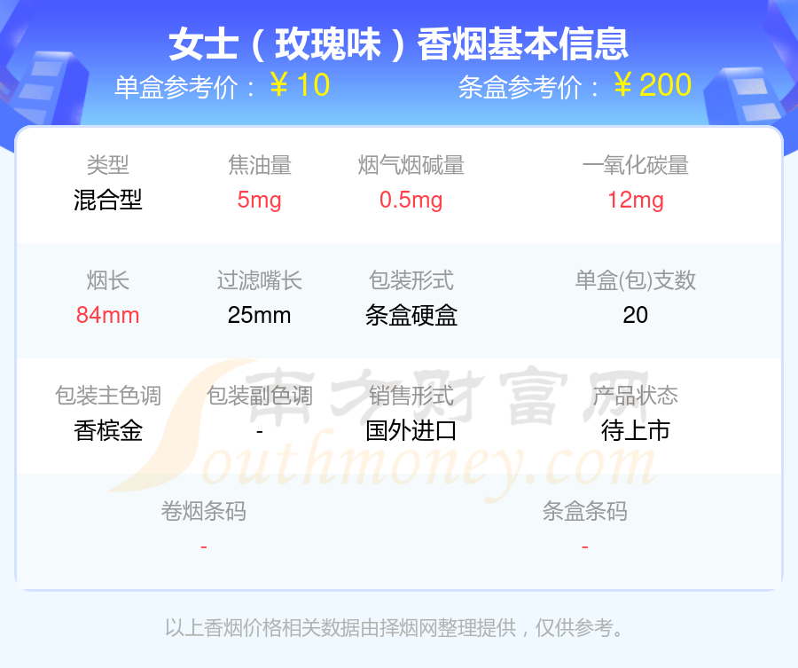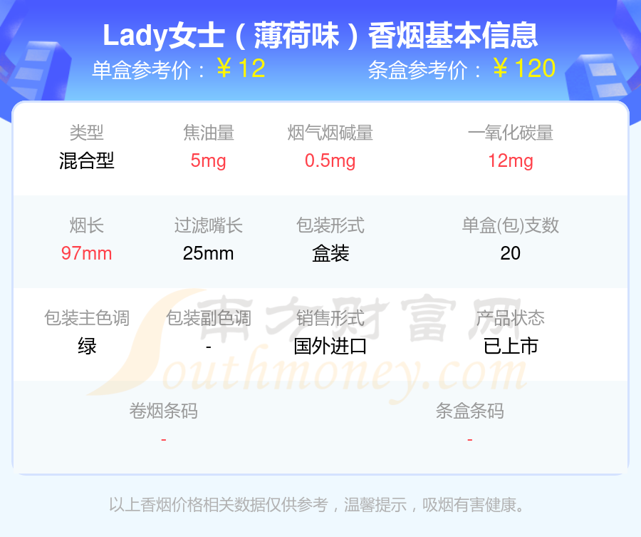 擇煙網(wǎng)為大家盤點(diǎn)了Lady(女士)香煙煙堿量低于5mg的,分別有女士(薄荷味)、Lady女士(薄荷味)、女士(玫瑰味)等,詳細(xì)價(jià)格如下: