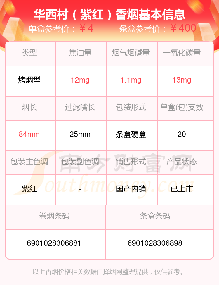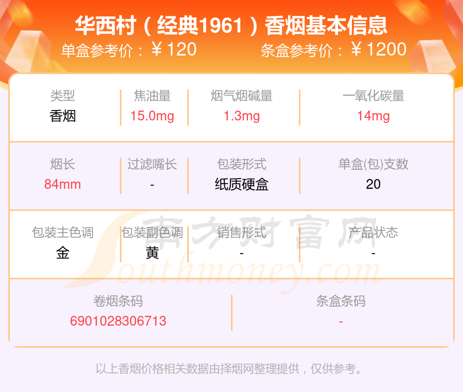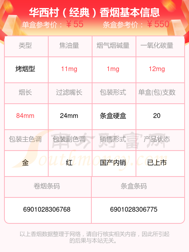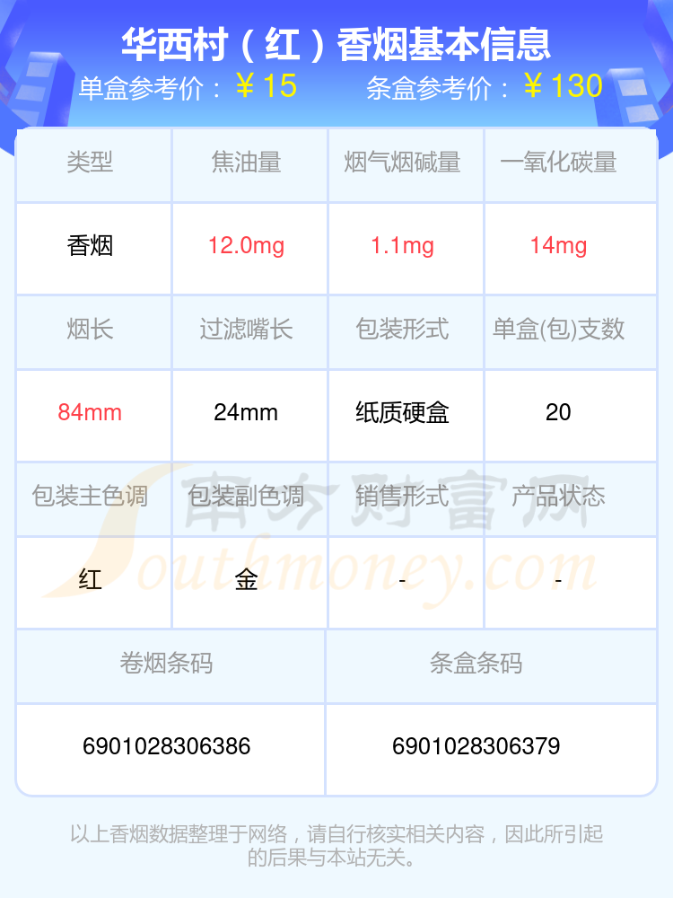 華西村香煙煙堿1mg到2mg的煙有華西村(經(jīng)典1961)、華西村(金)、華西村(佳品)、華西村(紫紅)、華西村(紅)、華西村(經(jīng)典)等,具體價(jià)格如下: