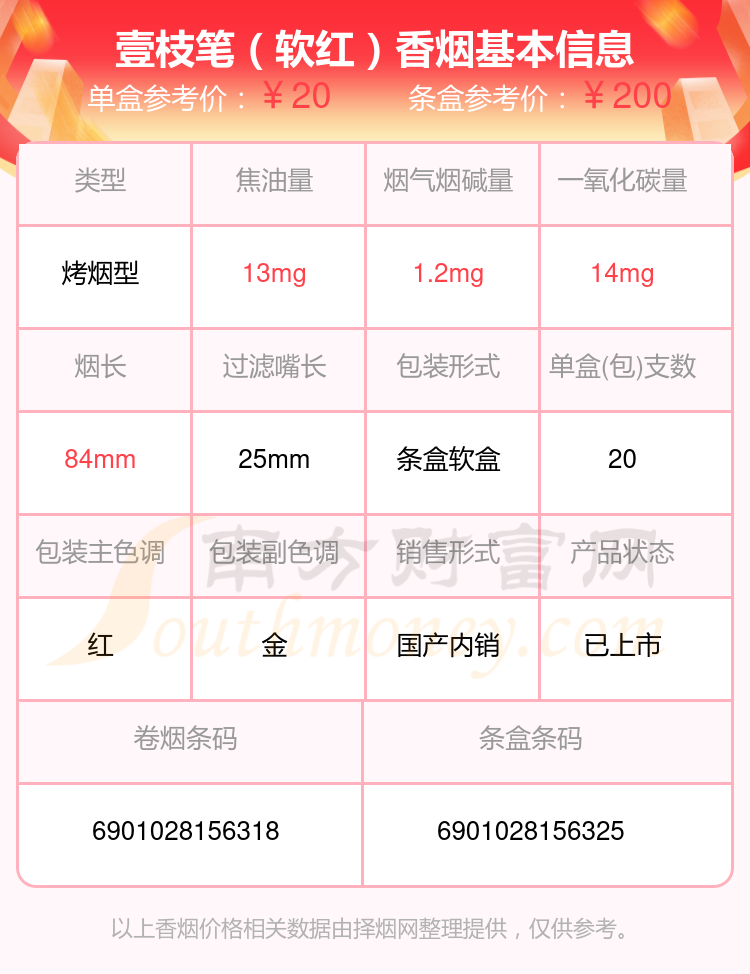 壹枝筆香煙煙堿低于4mg的煙分別有壹枝筆(新貴)參考價(jià)8元/包、壹枝筆(新品)參考價(jià)30元/包、壹枝筆(珍貴)參考價(jià)50元/包、壹枝筆(華貴2代)參考價(jià)10元/包、壹枝筆(宏圖)參考價(jià)10元/包、壹枝筆(華貴)參考價(jià)10元/包、壹枝筆(軟紅)參考價(jià)20元/包等。
