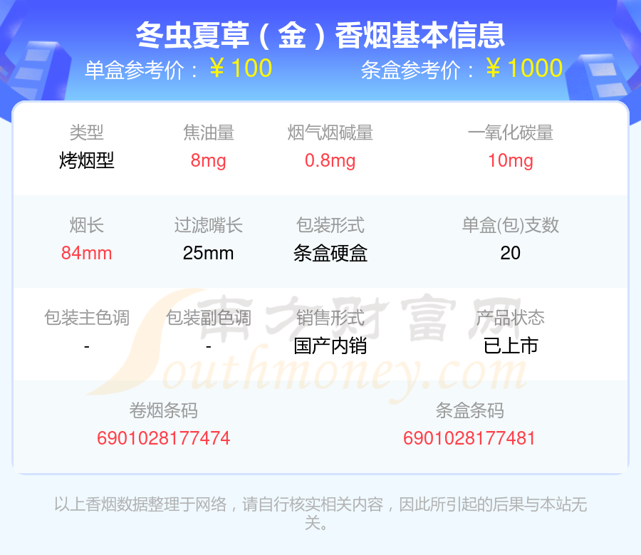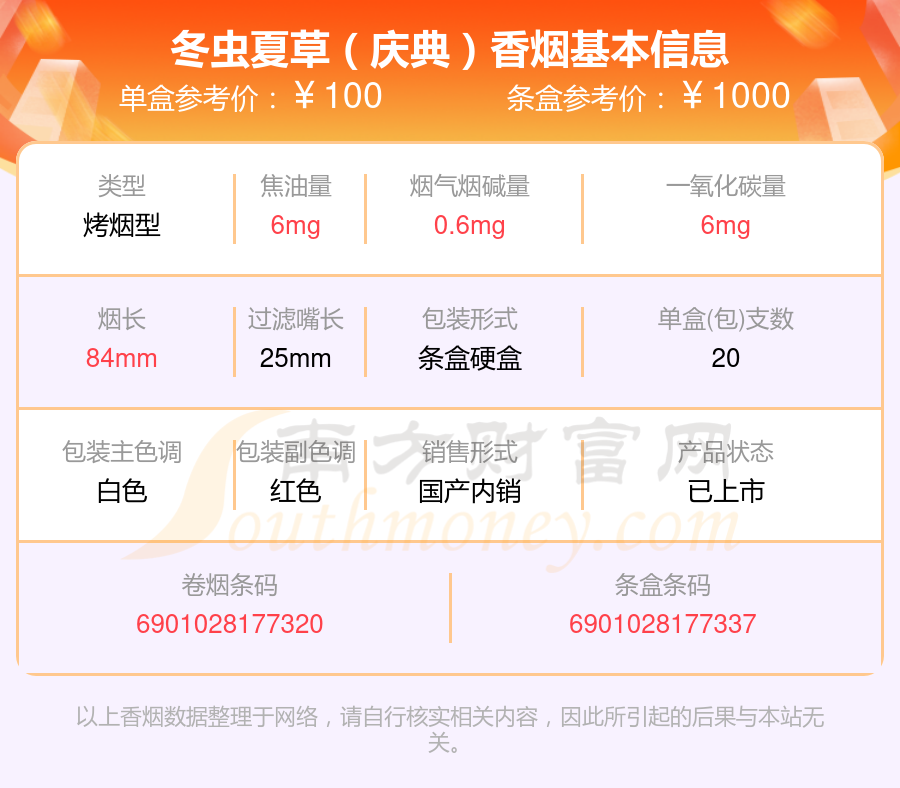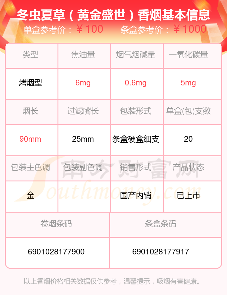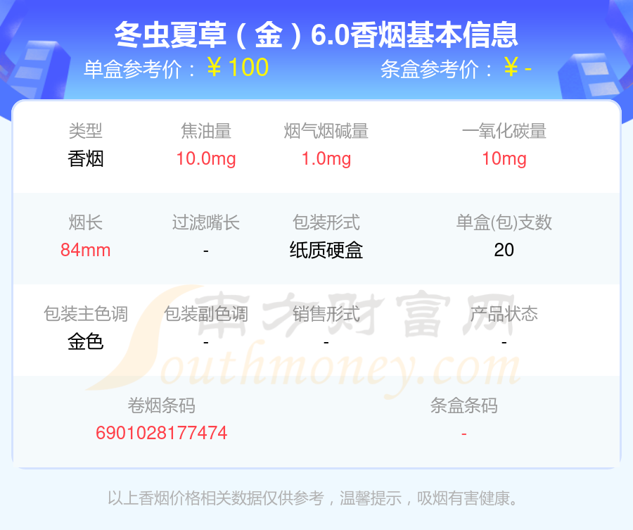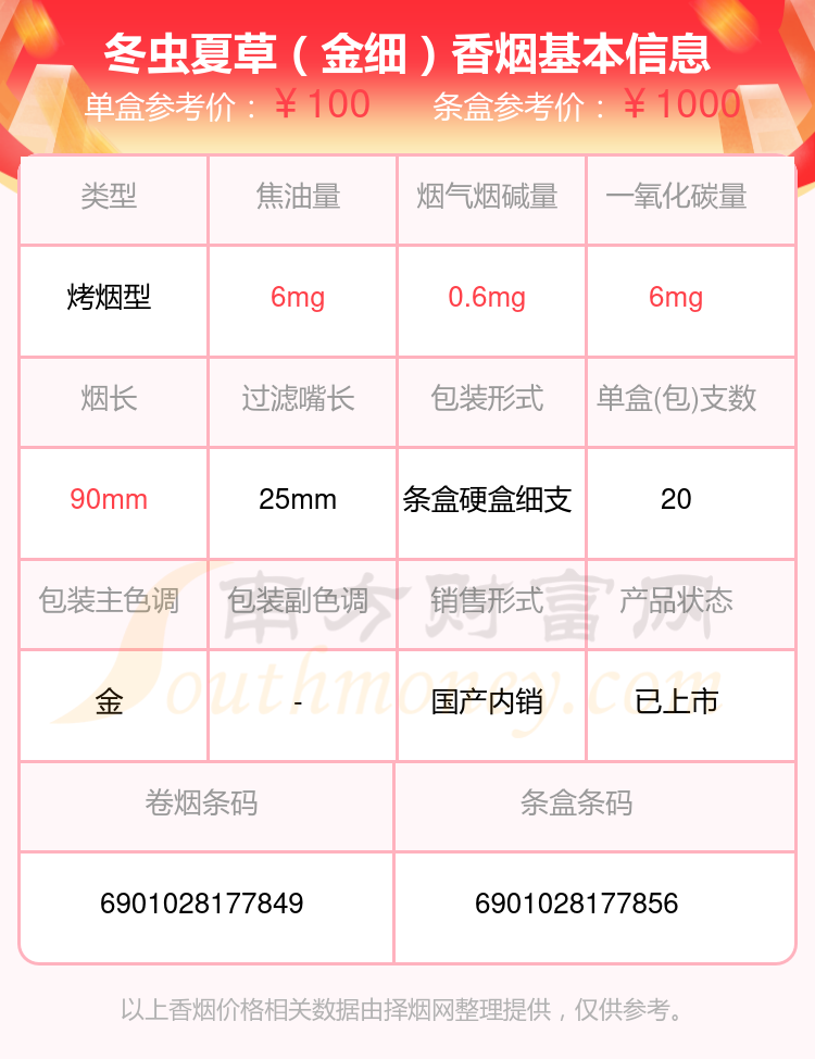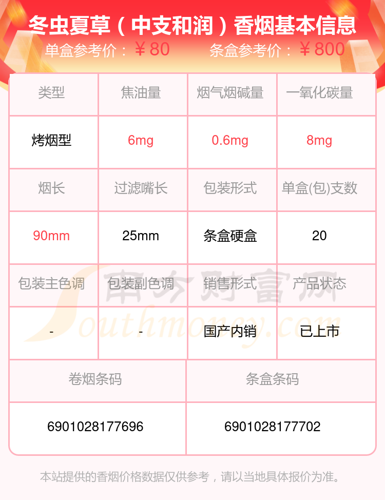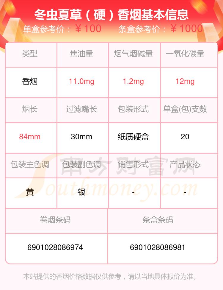 冬蟲夏草香煙80至100元左右的煙有哪些?擇煙網(wǎng)為大家整理提供,分別有:冬蟲夏草(中支和潤(rùn))、冬蟲夏草(金)6.0、冬蟲夏草(硬)、冬蟲夏草(金)、冬蟲夏草(黃金盛世)、冬蟲夏草(金細(xì))、冬蟲夏草(慶典)等,具體價(jià)格如下: