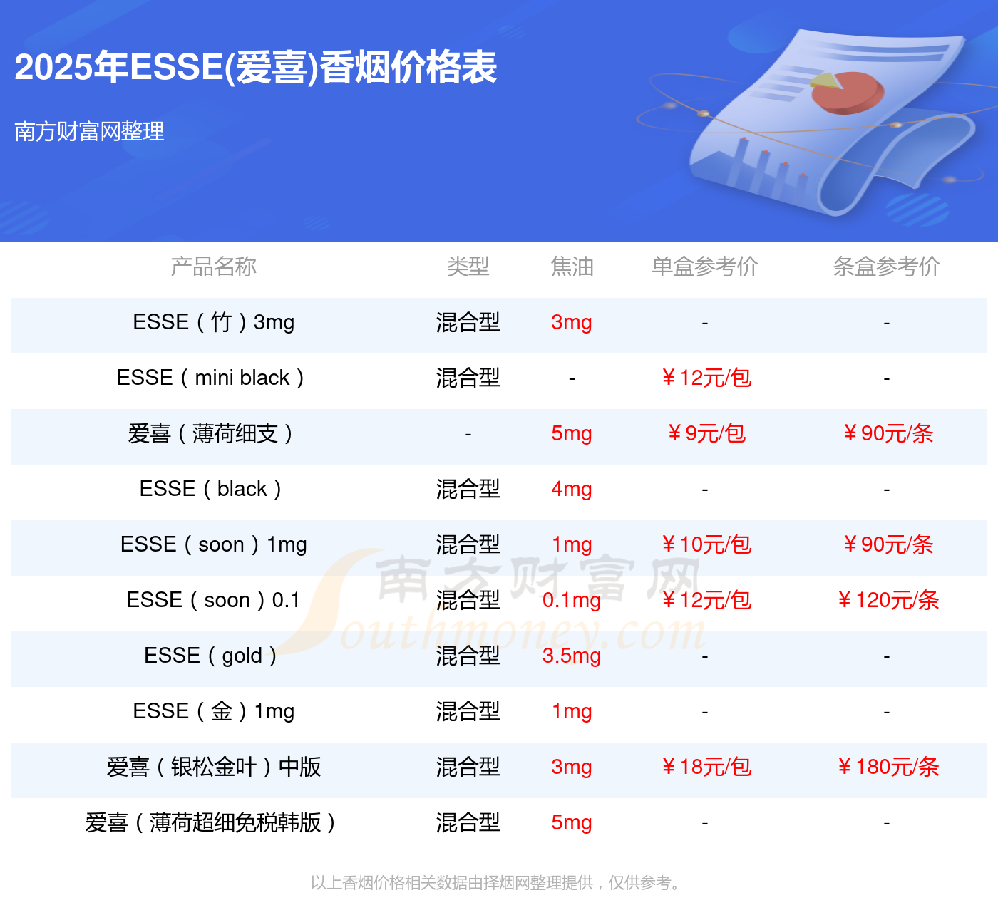 ESSE愛喜是韓國煙草公司旗下的品牌之一,目前中國大陸市場主要規(guī)格有ESSE薄荷(綠愛喜)、ESSE經(jīng)典(紅愛喜)、Esse特醇(藍愛喜)、Esse銀松(黑愛喜)等,是低刺激柔和的香煙。