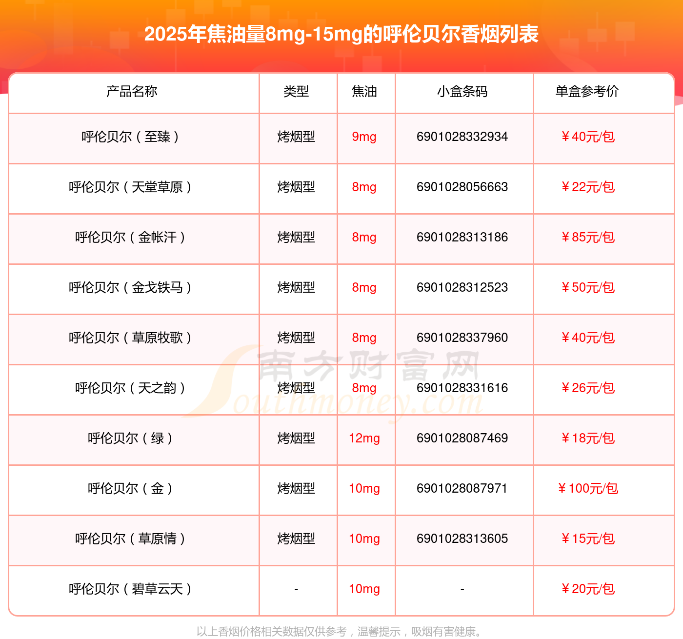 呼倫貝爾香煙焦油量8mg-15mg的有哪些?擇煙網(wǎng)為大家整理提供,分別有: