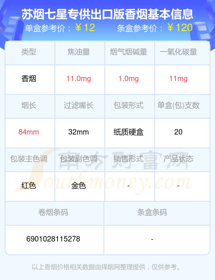 蘇煙七星專供出口版單盒參考價:12元