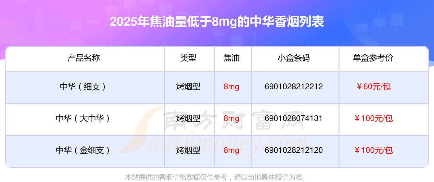 中華香煙焦油量低于8mg的煙有中華(細(xì)支)、中華(大中華)、中華(金細(xì)支)等,具體價格如下: