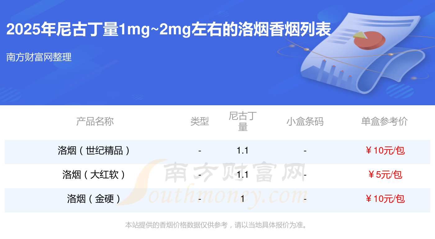 洛煙香煙尼古丁量1mg~2mg左右的煙有洛煙(世紀(jì)精品)、洛煙(大紅軟)、洛煙(金硬)等,詳細(xì)價(jià)格如下: