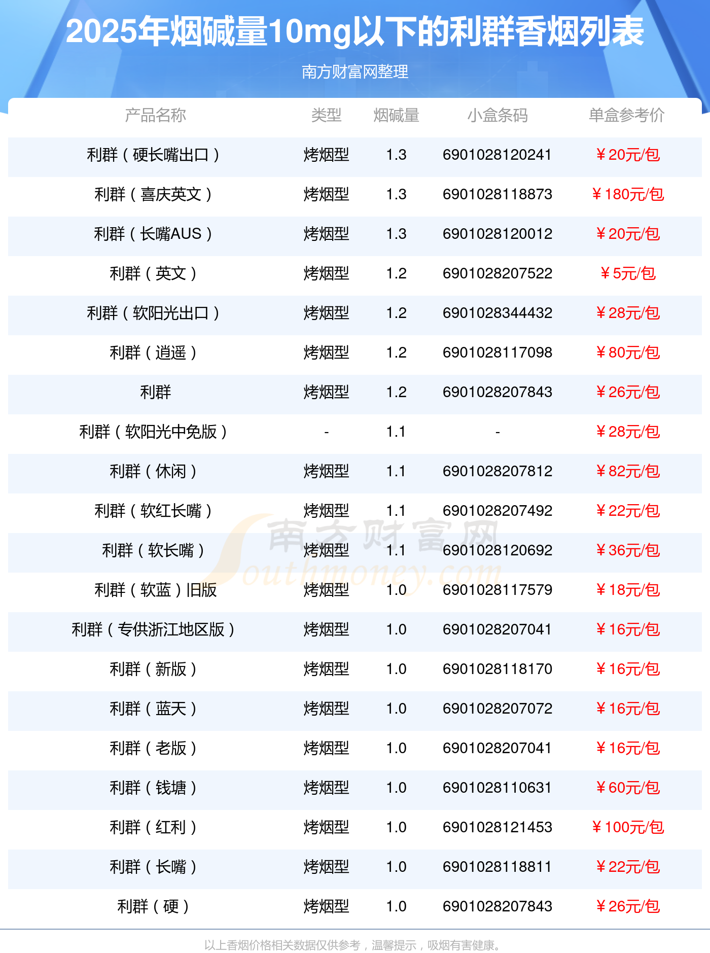 利群(硬長嘴出口)參考價20.0元/包、利群(喜慶英文)參考價180.0元/包、利群(長嘴AUS)參考價20.0元/包、利群(英文)參考價5.0元/包、利群(軟陽光出口)參考價28.0元/包、利群(逍遙)參考價80.0元/包、利群參考價26.0元/包、利群(軟陽光中免版)參考價28元/包、利群(休閑)參考價82.0元/包、利群(軟紅長嘴)參考價22.0元/包等。