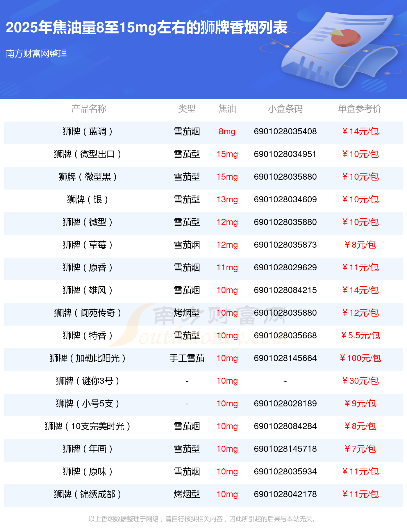 獅牌香煙焦油量8至15mg左右的煙有獅牌(藍(lán)調(diào))、獅牌(微型出口)、獅牌(微型黑)、獅牌(銀)、獅牌(微型)、獅牌(草莓)、獅牌(原香)、獅牌(雄風(fēng))、獅牌(閬苑傳奇)、獅牌(特香)等,具體價(jià)格如下: