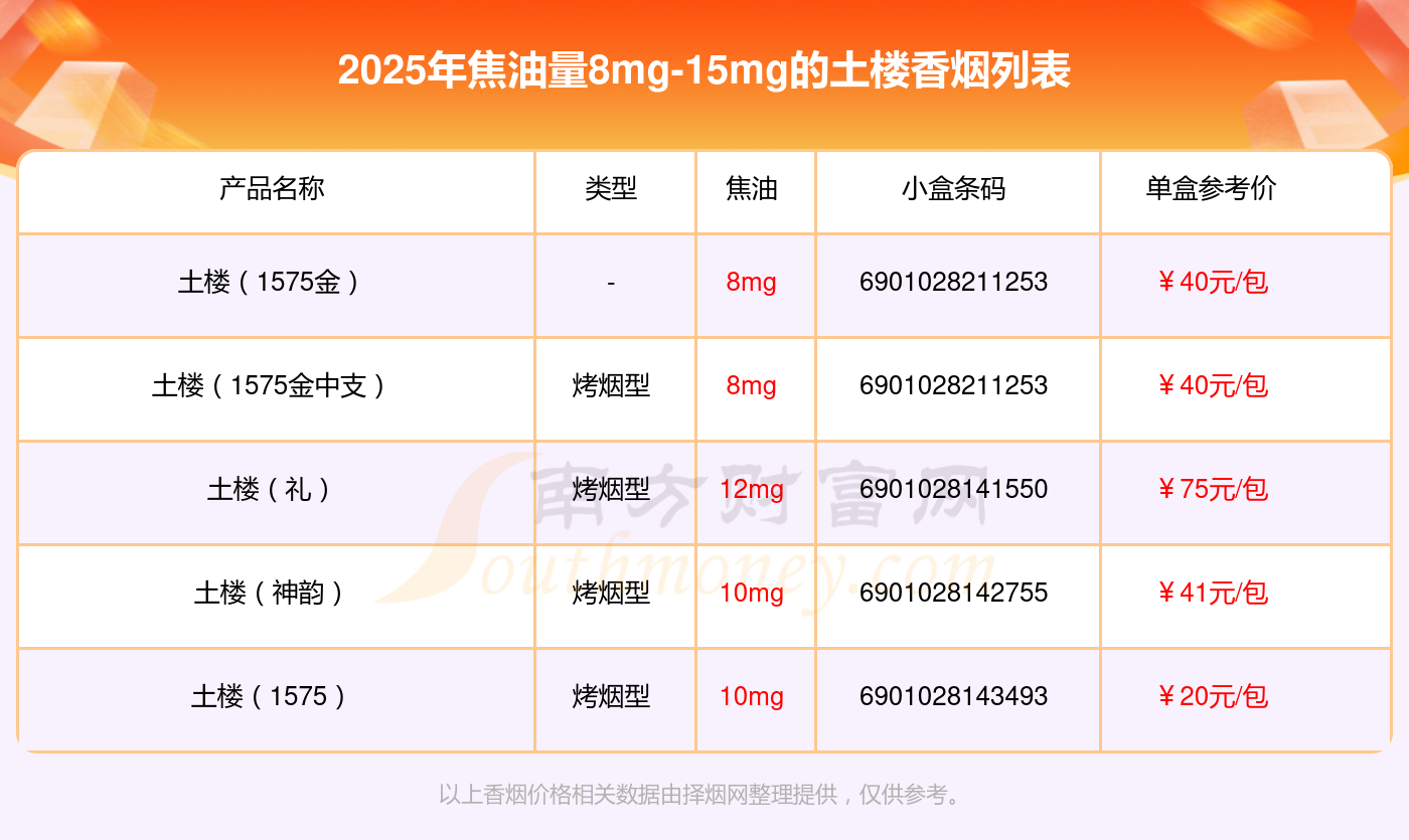 擇煙網(wǎng)為大家盤點了焦油量8mg-15mg的土樓香煙,有土樓(1575金)、土樓(1575金中支)、土樓(禮)、土樓(神韻)、土樓(1575)等,詳細(xì)價格如下: