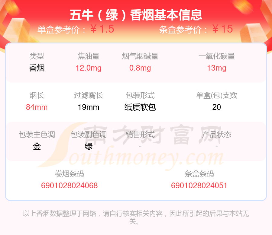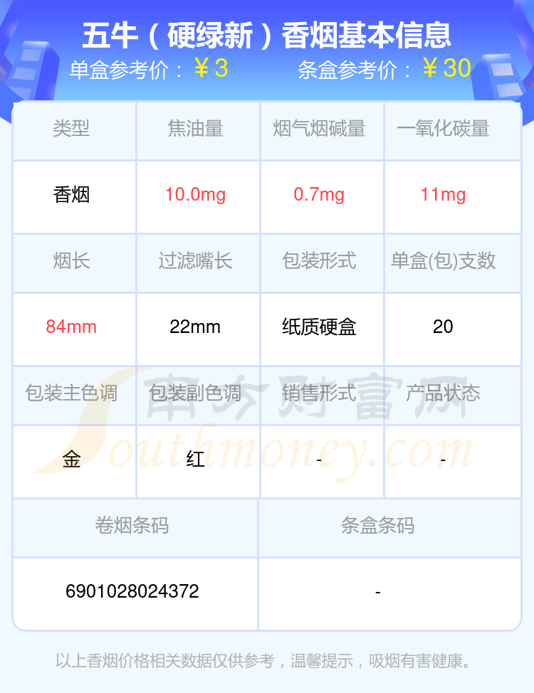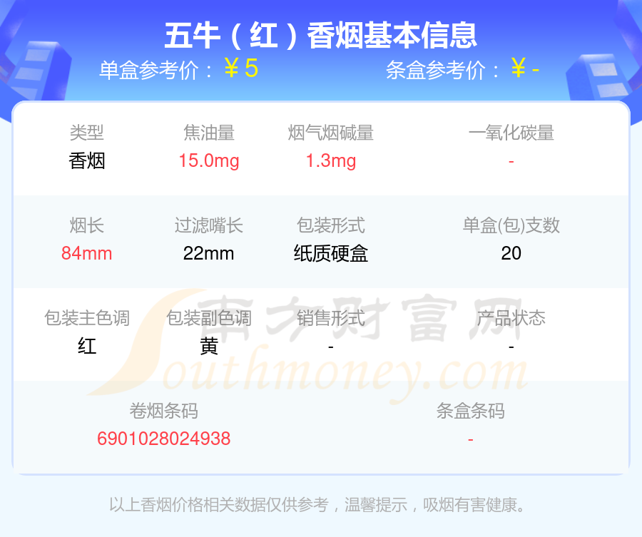擇煙網(wǎng)為大家盤點(diǎn)了五牛香煙焦油量8至15mg左右的,分別有五牛(紅)、五牛(硬金)、五牛(綠)、五牛(藍(lán)天地)、五牛(硬綠新)等,詳細(xì)價(jià)格如下: