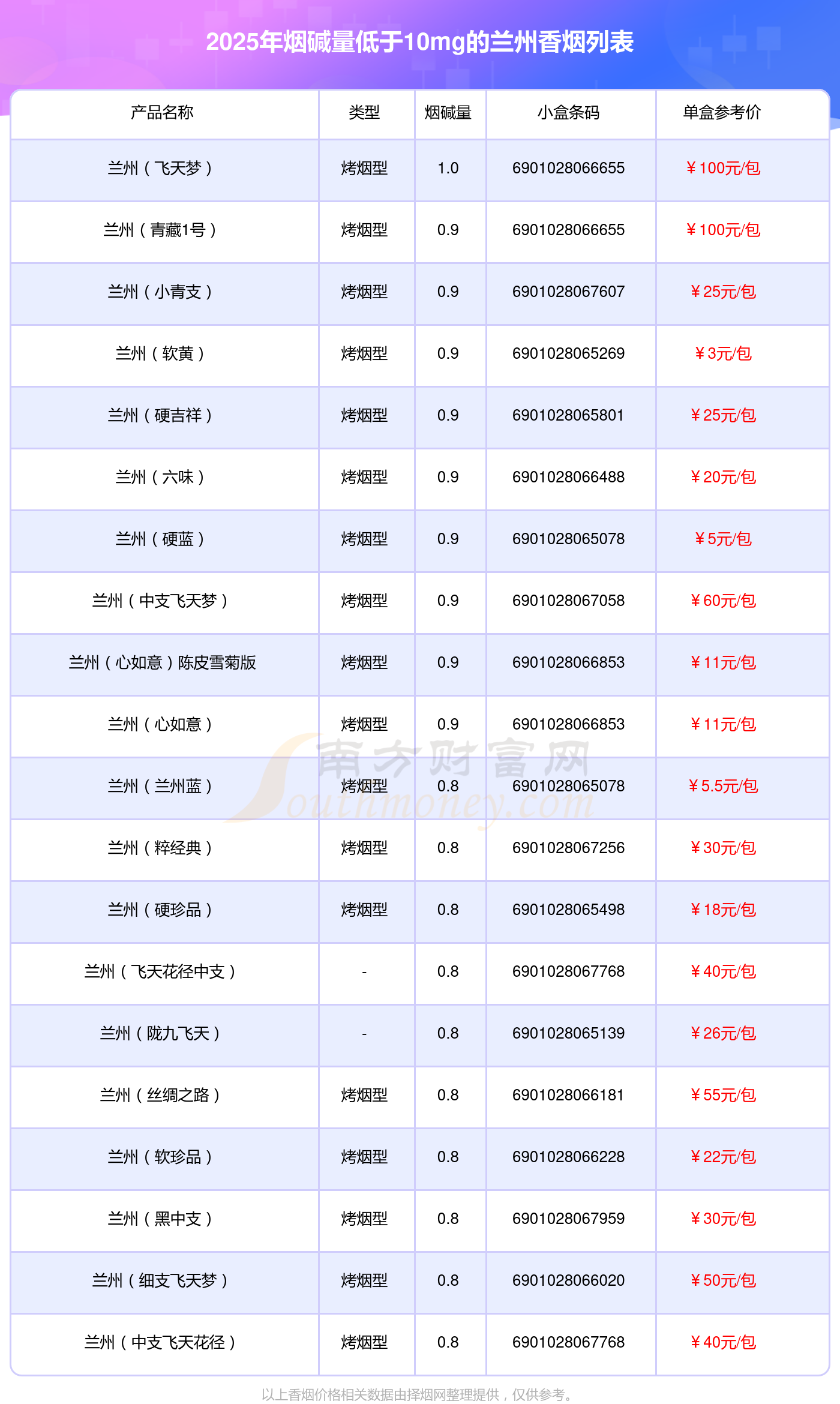 蘭州香煙煙堿量低于10mg的煙有蘭州(飛天夢)、蘭州(青藏1號)、蘭州(小青支)、蘭州(軟黃)、蘭州(硬吉祥)、蘭州(六味)、蘭州(硬藍)、蘭州(中支飛天夢)、蘭州(心如意)陳皮雪菊版、蘭州(心如意)等,具體價格如下: