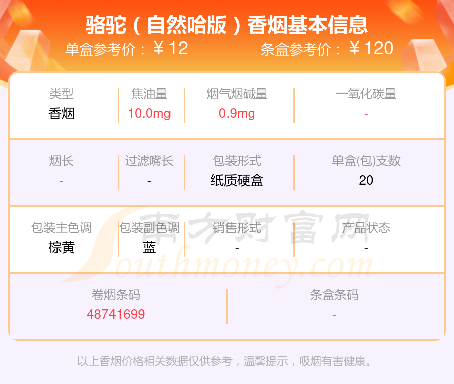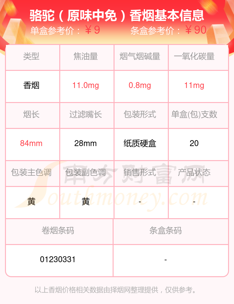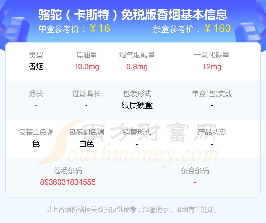 CAMEL(駱駝)香煙尼古丁量低于1mg的煙有駱駝(自然哈版)、駱駝(原味中免)、駱駝(硬黃)吉爾吉斯斯坦含稅版、駱駝(硬黃)塔吉克斯坦含稅版、駱駝(卡斯特)免稅版、駱駝(八角硬黃)中煙專賣版、駱駝(煙草版)、駱駝(硬)新版、駱駝(原味新版)、駱駝(黑)等,詳細價格如下: