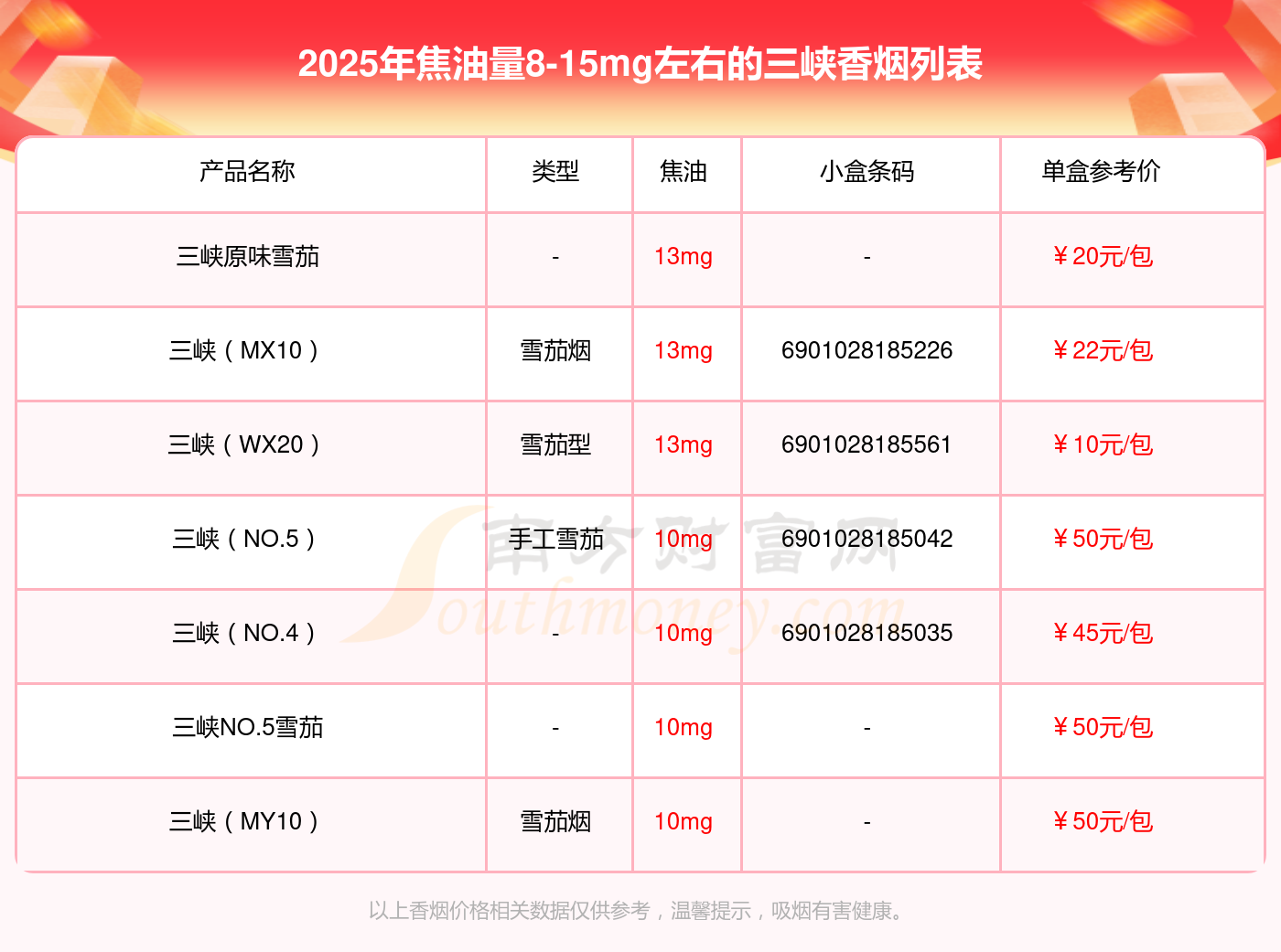三峽香煙焦油量8-15mg左右的煙有三峽原味雪茄、三峽(MX10)、三峽(WX20)、三峽(NO.5)、三峽(NO.4)、三峽NO.5雪茄、三峽(MY10)等,具體價格如下: