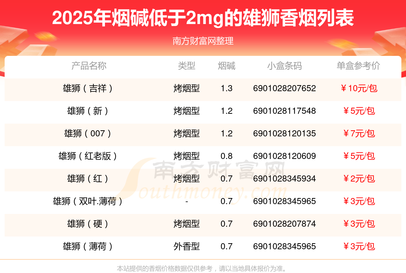 擇煙網(wǎng)為大家盤點了煙堿低于2mg的雄獅香煙,有雄獅(吉祥)、雄獅(新)、雄獅(007)、雄獅(紅老版)、雄獅(紅)、雄獅(雙葉.薄荷)、雄獅(硬)、雄獅(薄荷)等,詳細價格如下: