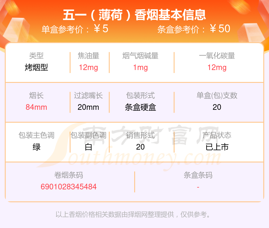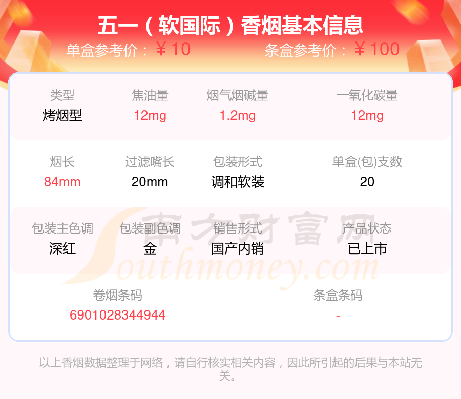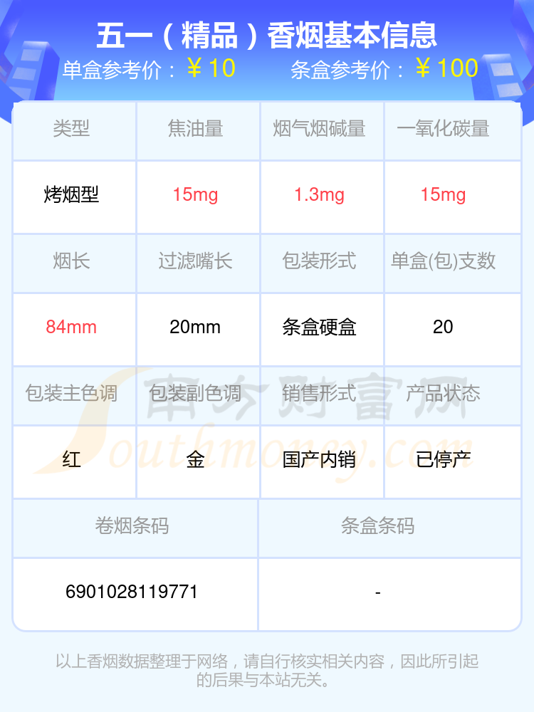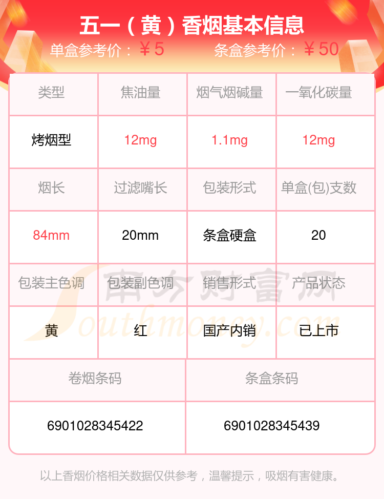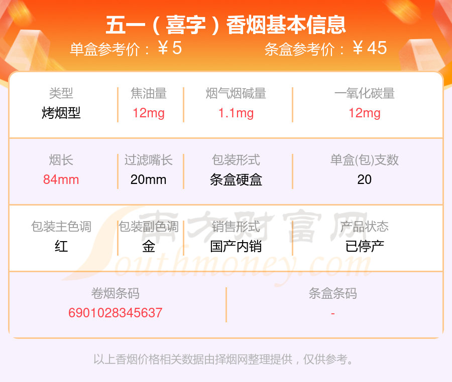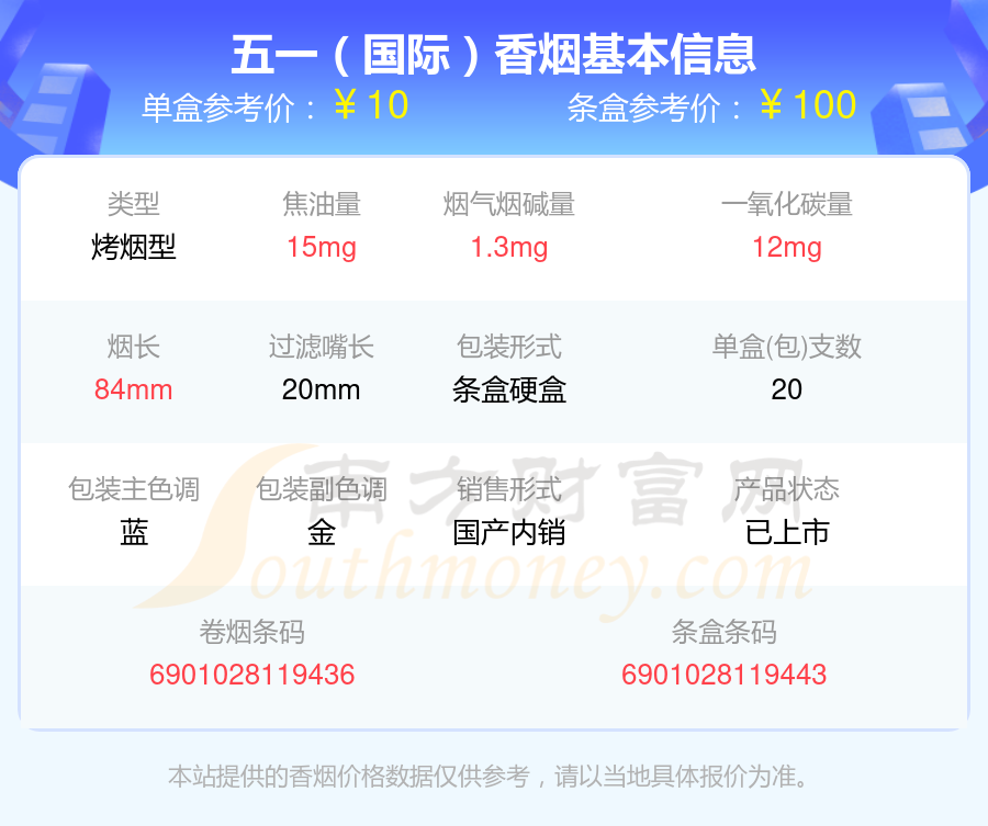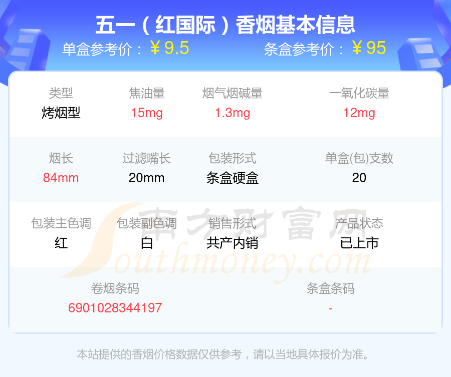 五一(精品)參考價10元/包、五一(紅國際)參考價9.5元/包、五一(國際)參考價10元/包、五一(硬)參考價6元/包、五一(喜字)參考價5元/包、五一(黃)參考價5元/包、五一(軟國際)參考價10元/包、五一(薄荷)參考價5元/包等。