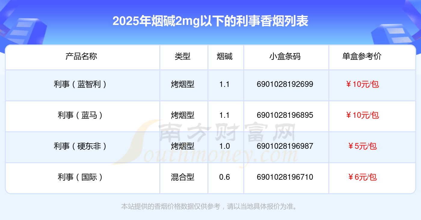 利事香煙煙堿2mg以下的煙有利事(藍(lán)智利)、利事(藍(lán)馬)、利事(硬東非)、利事(國際)等,具體價(jià)格如下: