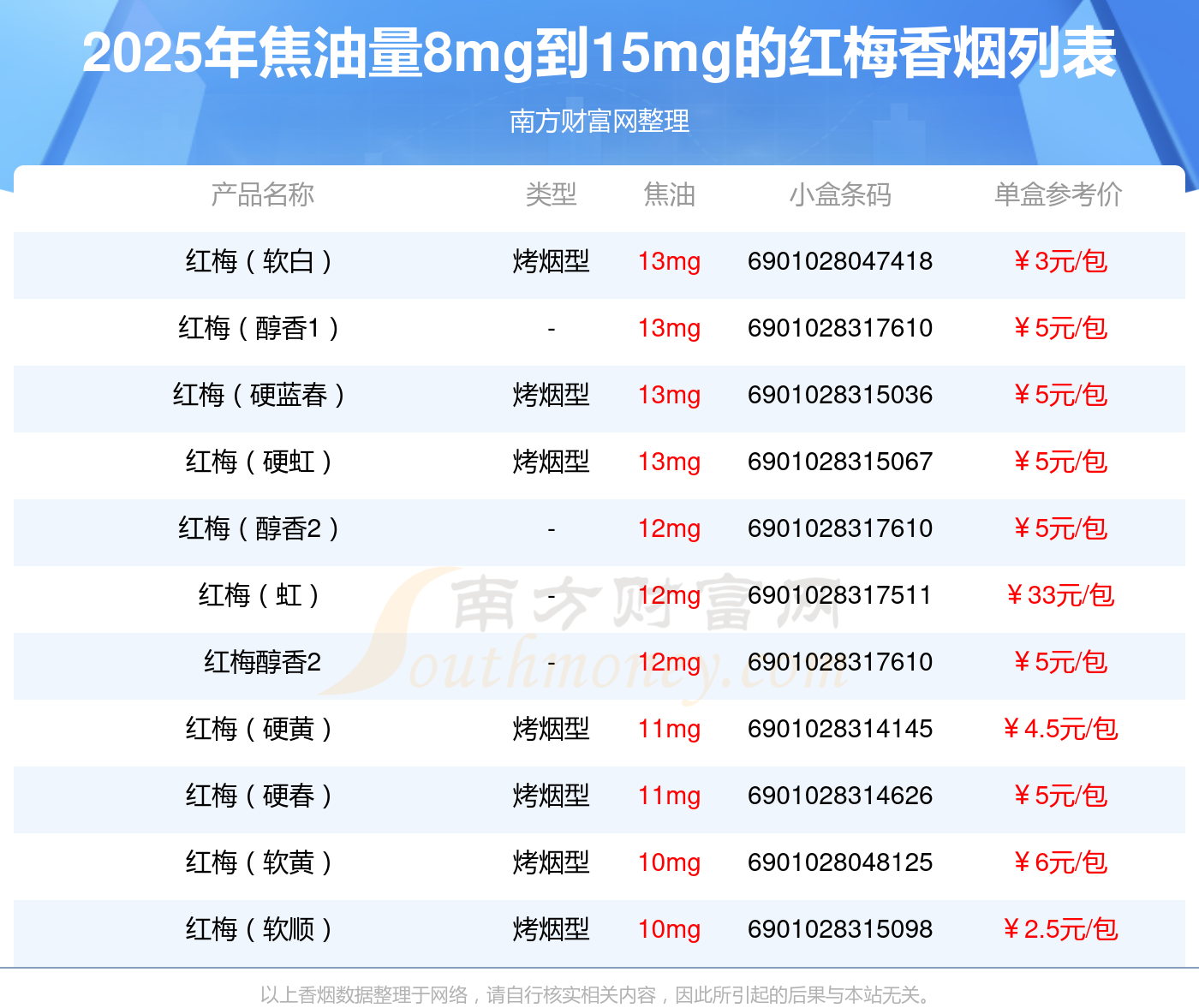 紅梅香煙焦油量8mg到15mg的煙有紅梅(軟白)、紅梅(醇香1)、紅梅(硬藍(lán)春)、紅梅(硬虹)、紅梅(醇香2)、紅梅(虹)、紅梅醇香2、紅梅(硬黃)、紅梅(硬春)、紅梅(軟黃)等,詳細(xì)價(jià)格如下: