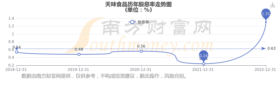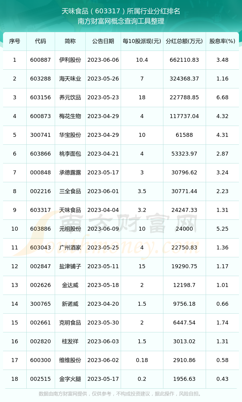 按照南方財富網(wǎng)趨勢選股系統(tǒng)統(tǒng)計,天味食品所屬行業(yè)為食品飲料行業(yè),食品飲料行業(yè)分紅排名情況如下表: