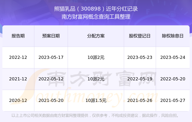 熊貓乳品最新一次公布的分紅方案為10派2元。本次權(quán)益分派股權(quán)登記日為2023年5月23日,除權(quán)除息日為2023年5月24日,派息日為2023年5月24日。