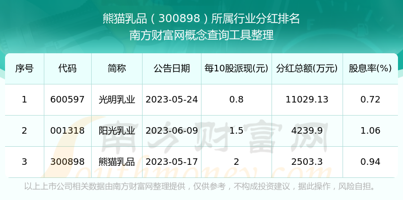 按照南方財(cái)富網(wǎng)趨勢(shì)選股系統(tǒng)統(tǒng)計(jì),熊貓乳品所屬行業(yè)為乳制品行業(yè),乳制品行業(yè)分紅排名情況如下表: